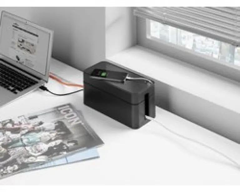 De deksel van de Durable Cavoline Box S heeft een ronde opening speciaal bedoeld voor de oplaadkabel van je mobiele telefoon. Zo kun je je telefoon makkelijk opladen zonder de doos te hoeven openen. Dit maakt het gebruik niet alleen praktisch maar ook veilig, want de kabels blijven netjes opgeborgen en uit het zicht.