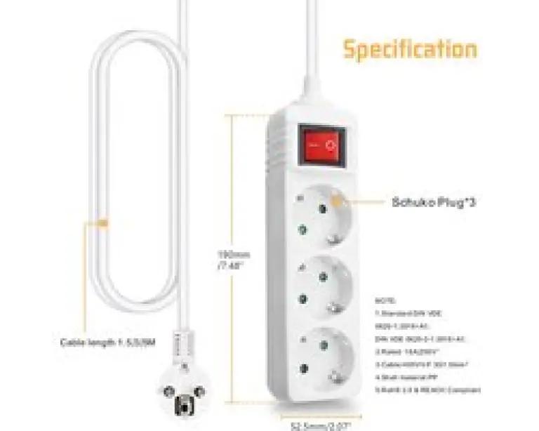 De stekkerdoos is uitgerust met een handige schakelaar, zodat je eenvoudig alle aangesloten apparaten tegelijk aan of uit kunt zetten. Dankzij de standaard Schuko stekker past hij in de meeste Nederlandse stopcontacten. De stekkerdoos werkt op een spanning van 230 V, wat standaard is in huishoudens.