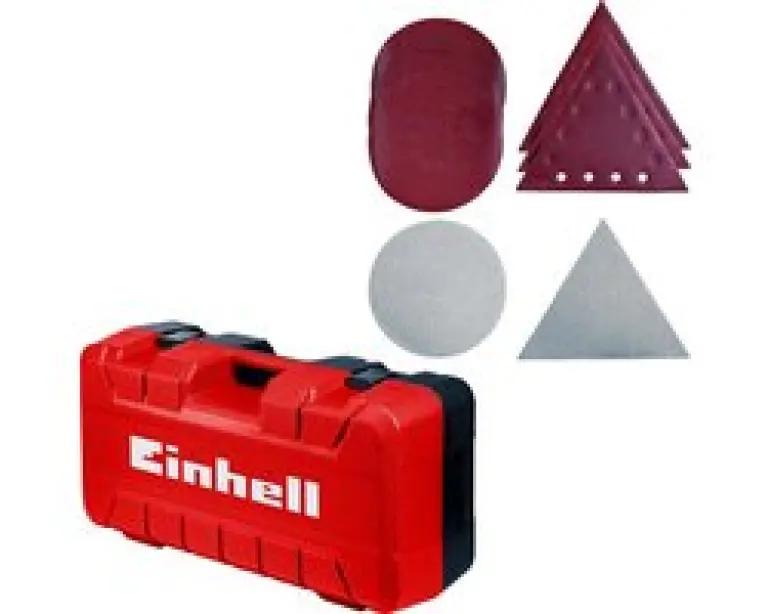 De wand- en plafondschuurmachine wordt geleverd met een uitgebreide set accessoires, waaronder 3 schuurschijven van 225 mm in verschillende korrelgroottes (P60, P80, P120), 3 driehoekige schuurschijven van 285 mm en 2 hoogwaardige schuurgazen (rond en driehoekig). Alles past netjes in de robuuste Einhell E-Box, waardoor je je materiaal overzichtelijk en veilig opbergt en eenvoudig meeneemt.