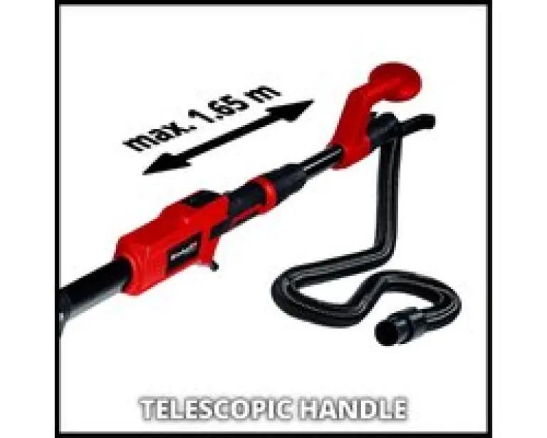 Werken boven je hoofd? Geen probleem! De telescoopsteel van de Einhell schuurmachine is traploos verstelbaar tot 165 cm, zodat jij altijd in een comfortabele houding kunt werken. De inklapbare lange handgreep maakt het bovendien snel en eenvoudig om de machine te monteren en te demonteren. Zo werk je efficiënt en zonder vermoeidheid aan je projecten.
