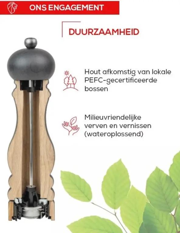 De molen is vervaardigd van hout afkomstig uit bossen met het PEFC-label, wat staat voor verantwoord bosbeheer. Het hout is gelakt met wateroplosbare verf en vernis, wat milieuvriendelijk is. De bediening is volledig handmatig, wat zorgt voor een authentieke ervaring en meer controle bij het malen. De molen wordt geleverd inclusief peperkorrels, zodat je meteen aan de slag kunt met het toevoegen van smaak aan je gerechten. Het product is geschikt voor navulling, waardoor je er lang plezier van hebt.