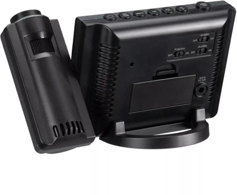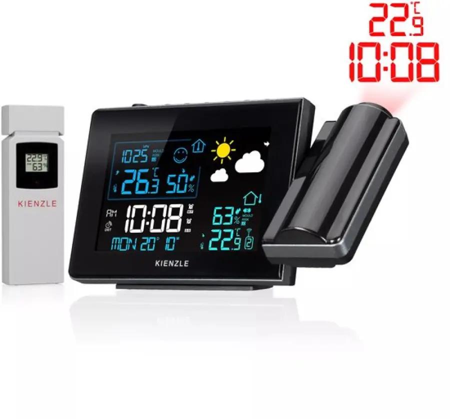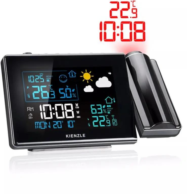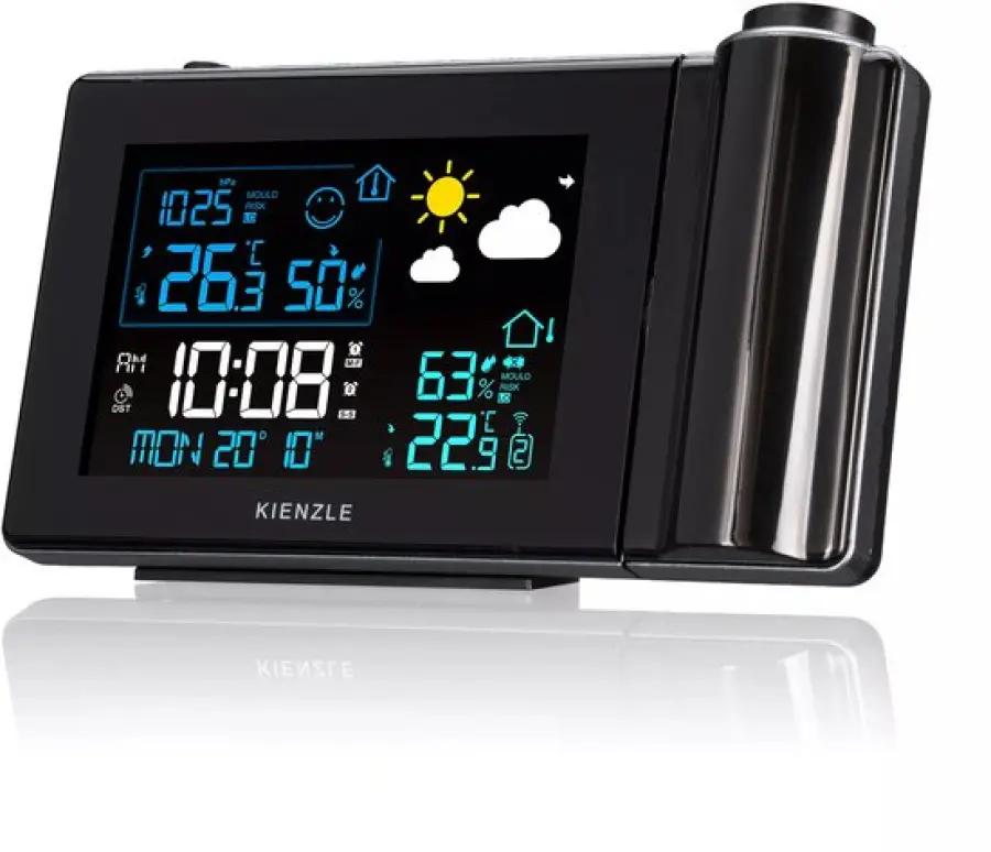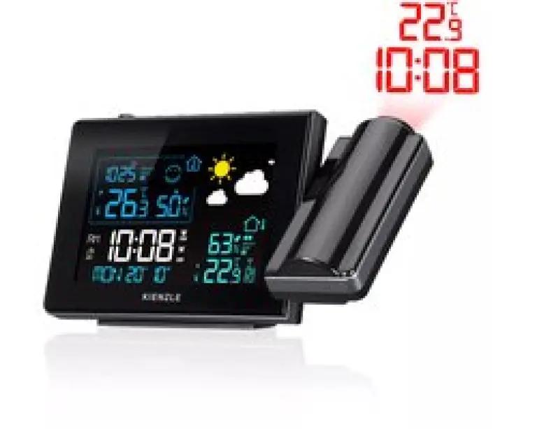 Met het Kienzle radiogestuurde weerstation 14993 hoef je nooit meer te zoeken naar de tijd of temperatuur. Dit slimme apparaat projecteert de actuele tijd en temperatuur direct op je muur of plafond, zodat je deze altijd gemakkelijk kunt aflezen, zelfs in het donker. De strakke zwarte behuizing past perfect in een modern interieur en geeft je kamer een stijlvolle uitstraling.