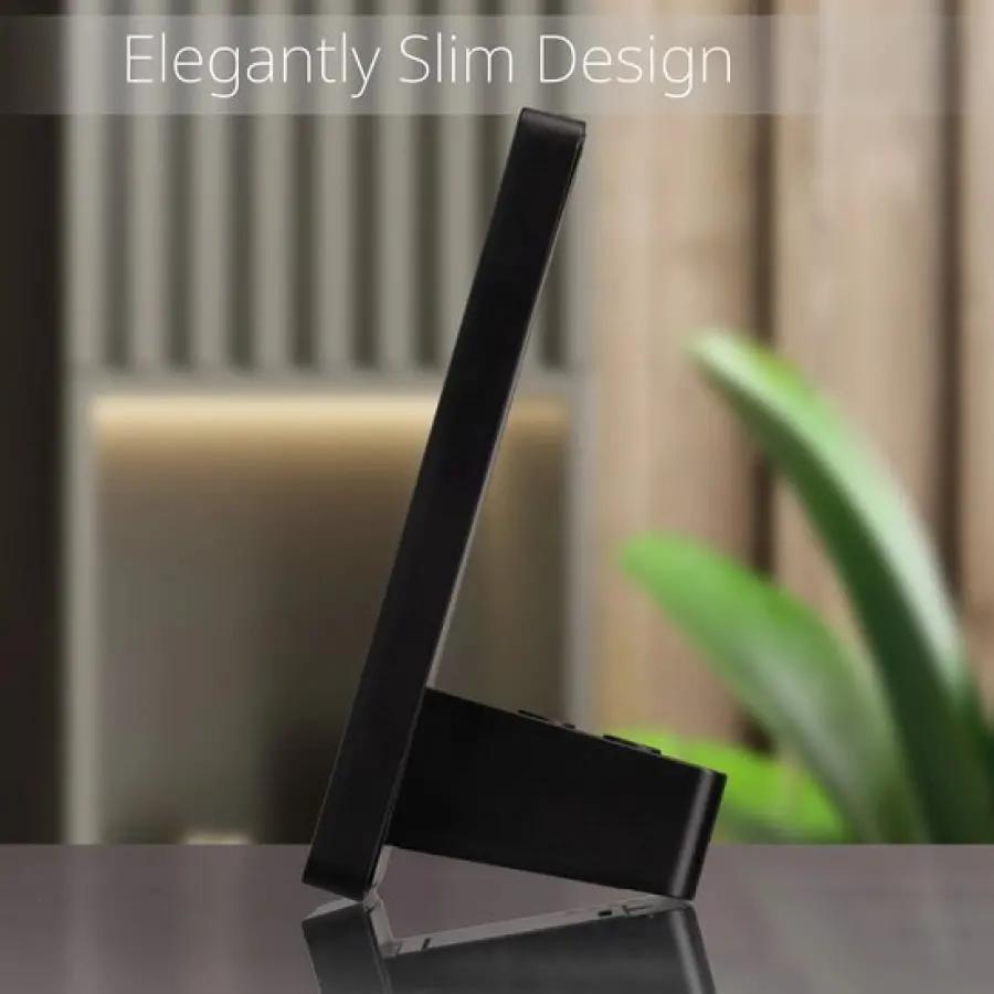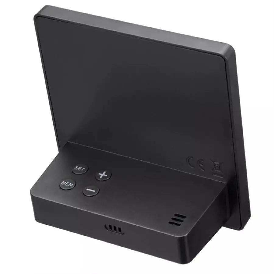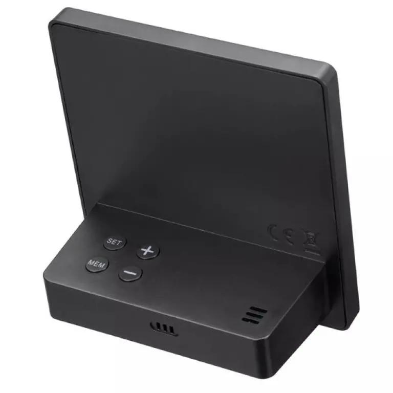 Het slanke, zwarte kunststof design past moeiteloos in elk interieur. De buitensensor is makkelijk op te hangen of neer te zetten dankzij het ophangoog en de standaard. Werkend op batterijen (2x AAA, niet inbegrepen) is het apparaat bovendien flexibel te plaatsen zonder gedoe met kabels.