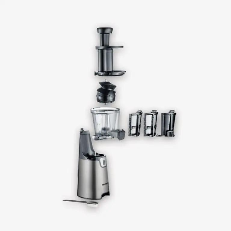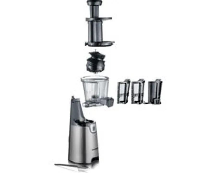| Verpakkingsinhoud | Slowjuicer, Pulpcontainer, Sapcontainer, Sorbet inzetdeel, Zeef inzetdeel (grof), Zeef inzetdeel (fijn), Schoonmaak borstel, Wormwielhuis, Wormwiel drijfwerk, Deksel en vultrechter, Stamper, Handleiding. |