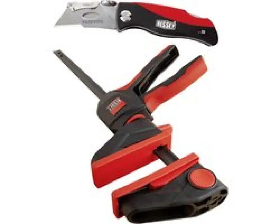 Verpakkingsinhoud 2x 1-handklem met draaibare handgreep EZ360-30, 1x kling-klapmes DBKPH-EU