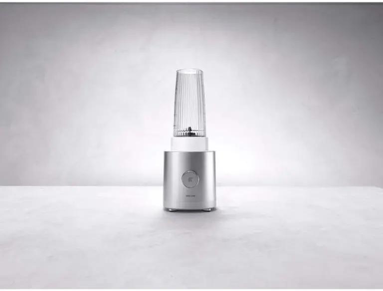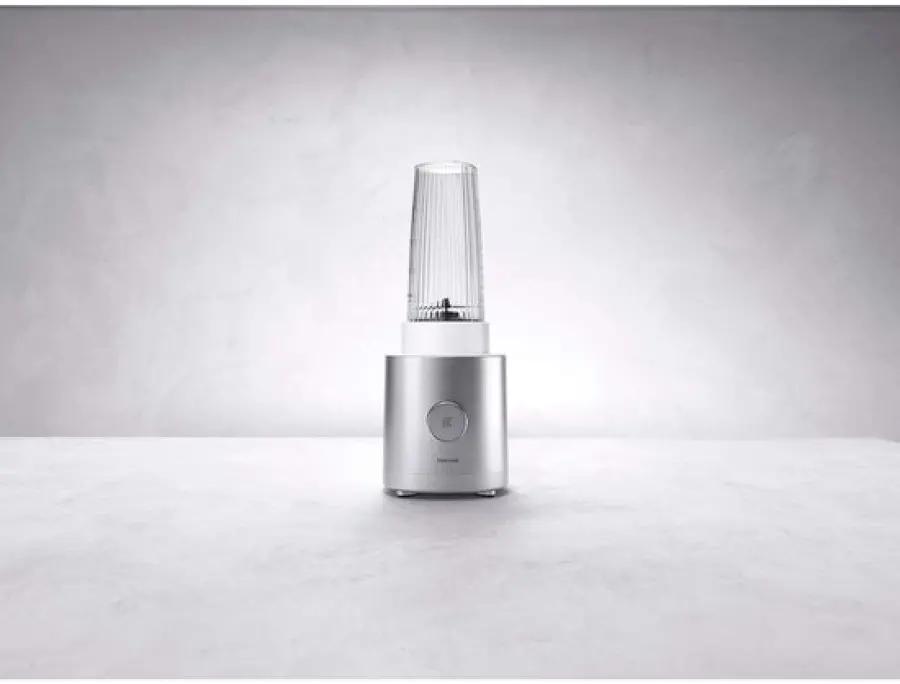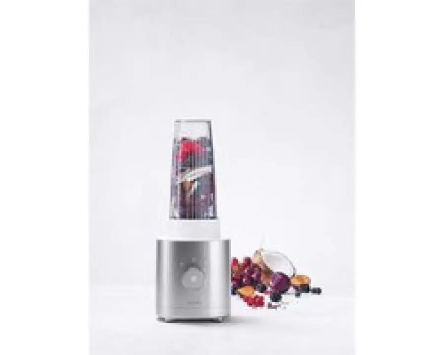 De meegeleverde drinkbeker is gemaakt van BPA-vrij Tritan, is breukvast en heeft een inhoud van 550 ml. Dankzij het to-go drinkdeksel neem je jouw zelfgemaakte drankje overal mee naartoe. Hoewel de beker vaatwasmachinebestendig is, wordt handmatig reinigen aanbevolen om de levensduur te verlengen. Het moderne design met één knop en het gladde oppervlak zorgen ervoor dat de buitenkant van de blender makkelijk schoon te houden is.