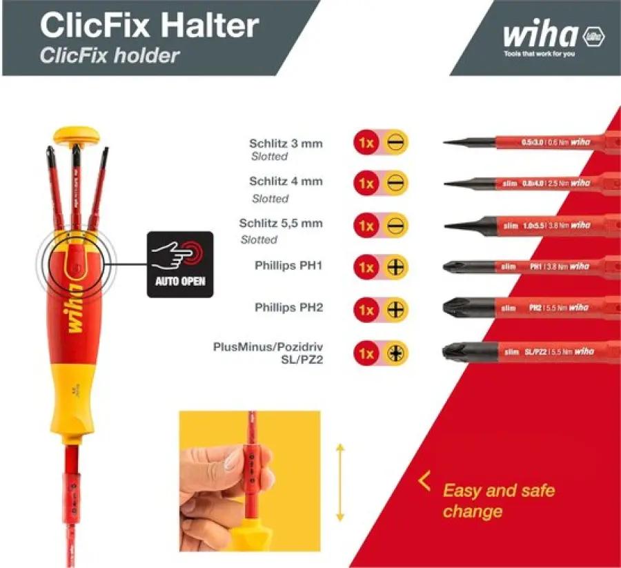 De schroevendraaier beschikt over een innovatief bitmagazijn in de handgreep, dat plaats biedt aan zes verschillende slimBits. Met een simpele druk op de knop komen de bits omhoog, waardoor je ze gemakkelijk kunt wisselen. De ClicFix-houder vergrendelt de bits stevig, wat zorgt voor een betrouwbare en universele inzetbaarheid. Dit slimme ontwerp bespaart je 75% volume en 50% gewicht, wat jouw werk een stuk efficiënter maakt.