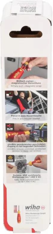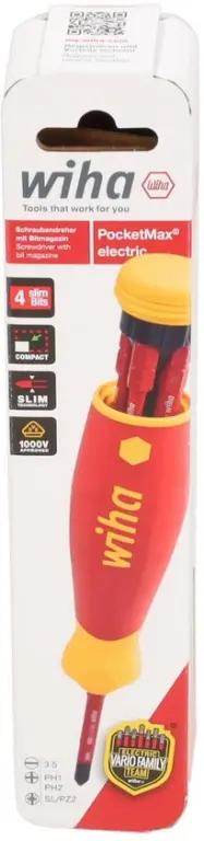 Deze handschroevendraaier is perfect geschikt voor het werken aan spanningsvoerende delen tot 1.000 V AC. De set bevat vier verschillende slimBits die veelzijdig inzetbaar zijn: sleuf 3,5 mm, Phillips PH1, Phillips PH2 en plusminus/Pozidriv SL/PZ2, elk 75 mm lang.