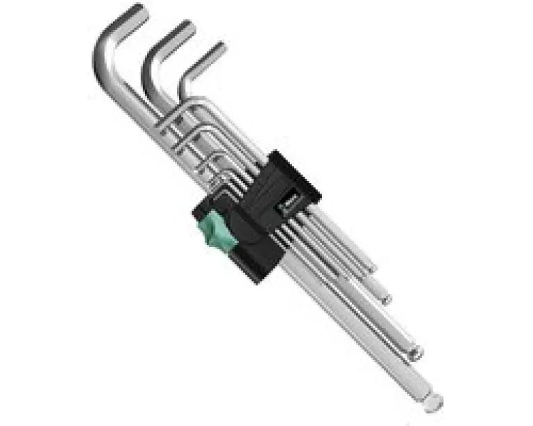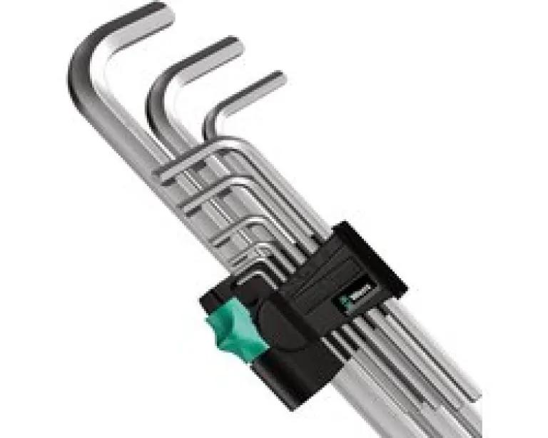 De Wera 950 9 Hex-Plus inbussleutelset bevat negen sleutels in verschillende maten: 1.5, 2.0, 2.5, 3.0, 4.0, 5.0, 6.0, 8.0 en 10.0 millimeter. Zo heb je altijd de juiste maat bij de hand voor binnenzeskant-schroeven. De sleutels zijn netjes geordend in een handige clip die het makkelijk maakt ze uit te nemen en weer op te bergen.