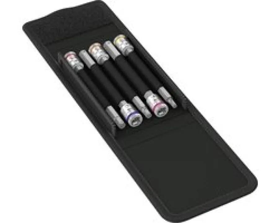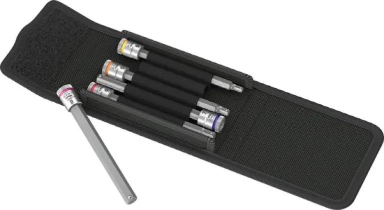 De set bestaat uit vijf dopsleutelbits in de maten SW 4, 5, 6, 7 en 8 mm. Ze zijn netjes opgeborgen met een handige klittenbandstrip, waardoor je ze makkelijk meeneemt en opbergt zonder ze kwijt te raken.