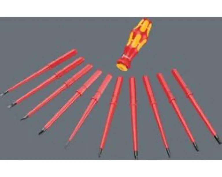 In deze set vind je een groot aantal gereedschappen, waaronder een VDE handgreep met 12 VDE klingen, diverse sleuf-, Phillips- en Torx-klingen, een Joker dubbele steeksleutel met vasthoudfunctie en kleine terughaalhoek, en een uiterst snelle 1/4" Zyklop Speed ratel met handige accessoires. Ook zijn er 8 hand- en machinedoppen in verschillende maten, een universele bithouder, een schroefklauw om schroeven vast te houden, en een stevig stoffen etui met een lange levensduur.