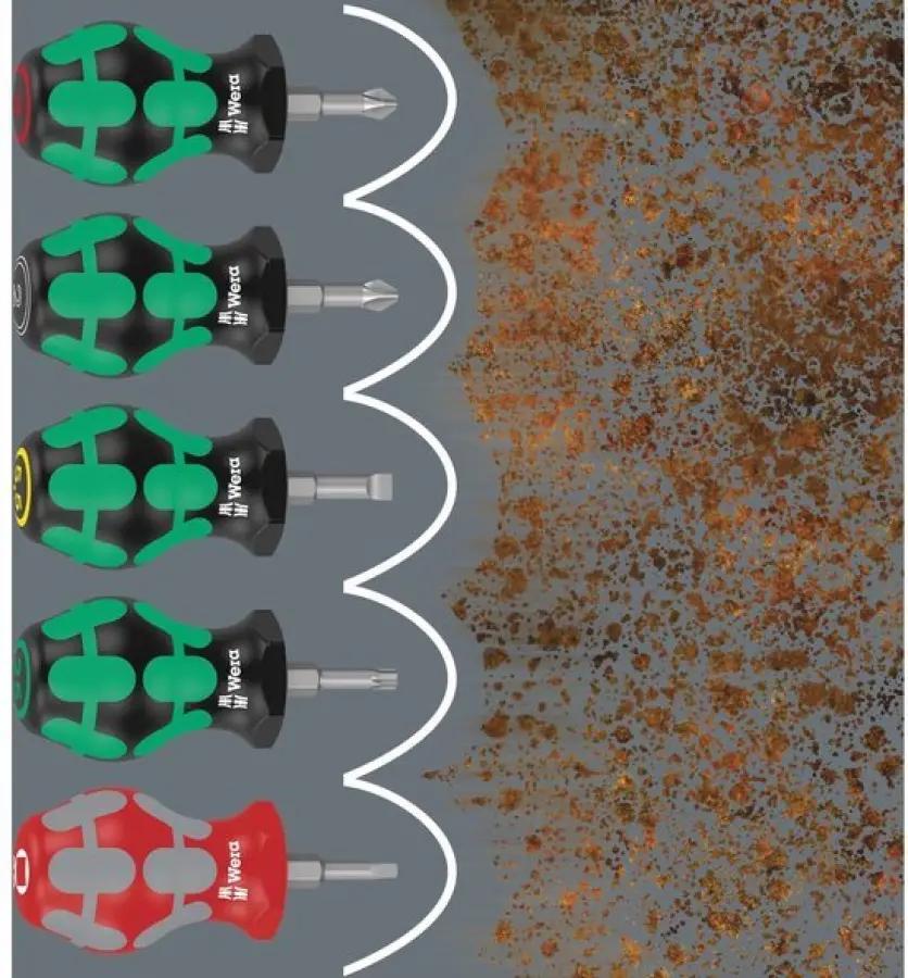 De klingen zijn voorzien van een speciale coating die extra bescherming biedt tegen corrosie en tegelijkertijd zorgt voor een uitstekende grip op de schroefkop. Dankzij de Wera Bit-technologie werk je sneller en efficiënter. Bovendien voorkomt de zeskantige wegrolbescherming dat de schroevendraaiers wegrollen op je werkplek.