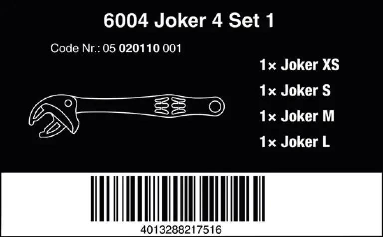 | Verpakkingsinhoud | 6004 Joker XS Zelfinstellende steeksleutel, 7-10 mm 05020099001 6004 Joker S Zelfinstellende steeksleutel, 10-13 mm 05020100001 6004 Joker M Zelfinstellende steeksleutel, 13-16 mm 05020103001 6004 Joker L Zelfinstellende steeksleutel, 16-19 mm 05020101001 |