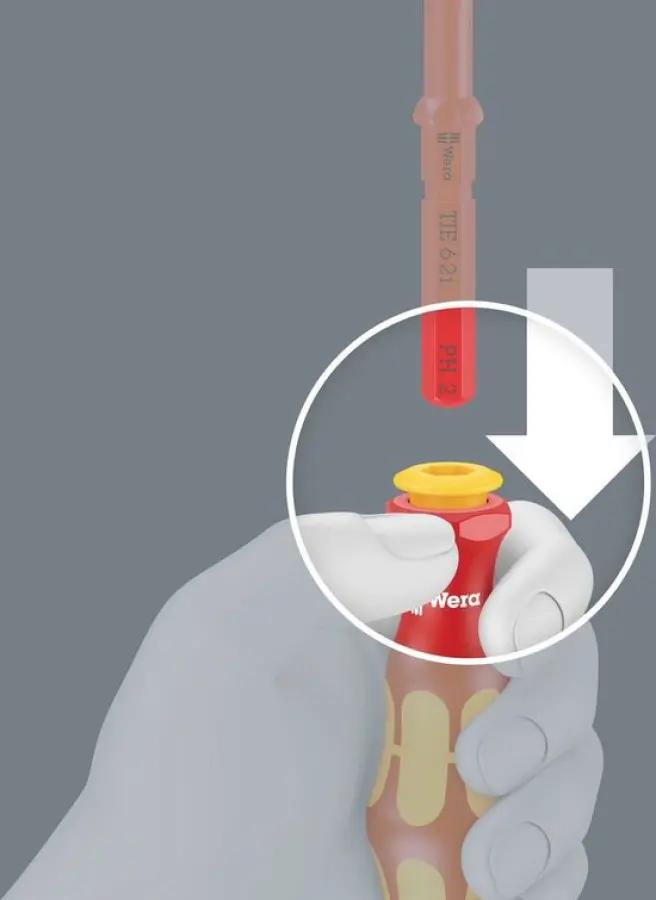 Deze set bestaat uit 1 ergonomische Kraftform handgreep 817 VDE met wegrolbeveiliging en 6 verwisselbare VDE-stelen van 157 mm lang. Dankzij de verwisselbare stelen met de handige Take it easy gereedschapsvinder, die kleurcodering en lasergegraveerde maataanduidingen combineert, vind je altijd snel de juiste bit. De compacte en robuuste gordeltas met fleece achterkant houdt je gereedschap netjes en is eenvoudig te bevestigen aan Wera 2go onderdelen, muren, schappen of werkplaatswagens dankzij de meegeleverde klittenbandstrip.