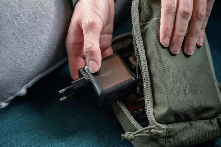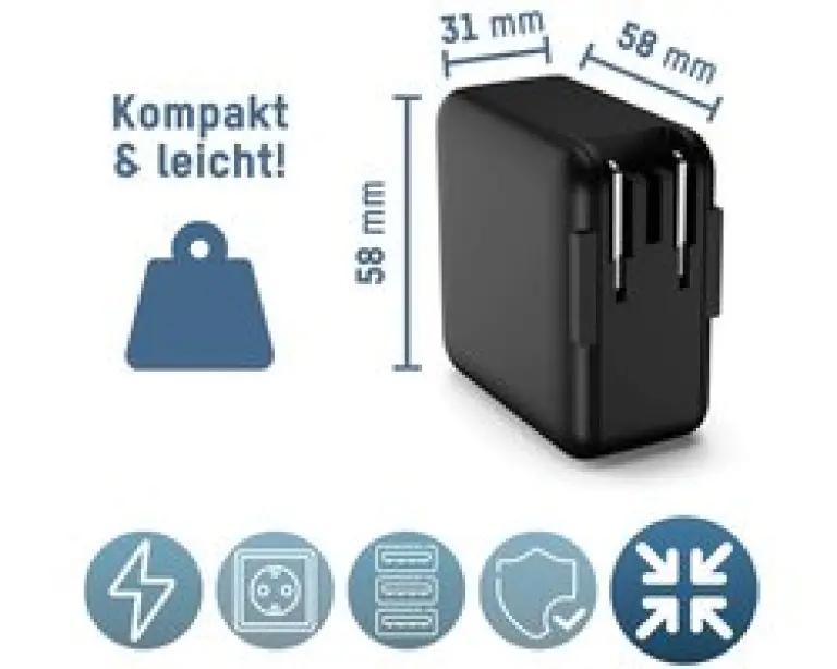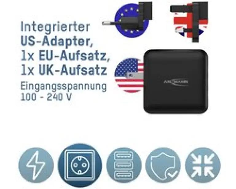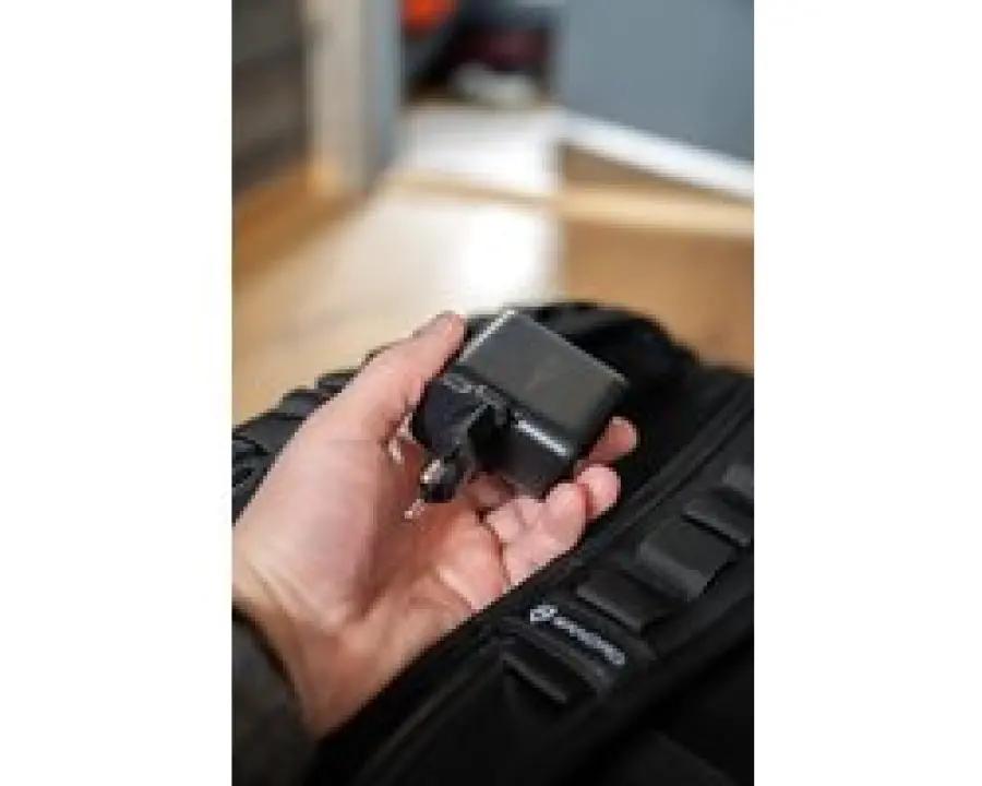 De oplader beschikt over een intrekbare US-stekker, waardoor hij erg compact en ruimtebesparend is. Zo past hij gemakkelijk in elke zak. Daarnaast worden verwisselbare stekkers voor UK en EU meegeleverd, die eenvoudig op de ingeklapte US-stekker kunnen worden bevestigd. Dit maakt het mogelijk om de oplader in veel landen wereldwijd te gebruiken, zonder gedoe.
