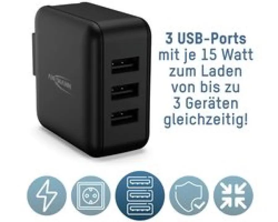 De Ansmann TC315 is een veelzijdige USB-oplader die ideaal is voor het gelijktijdig opladen van meerdere apparaten. Met drie USB-poorten kun je tot drie apparaten tegelijk voorzien van stroom, wat het perfect maakt voor thuis, op kantoor of onderweg.