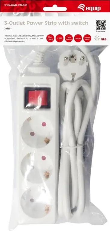 Met de EQUIP 245551 stekkerdoos heb je altijd voldoende stopcontacten binnen handbereik. Deze stekkerdoos is voorzien van drie stopcontacten, zodat je meerdere apparaten tegelijk kunt aansluiten zonder gedoe. Het compacte formaat en de witte kleur maken het een stijlvolle en praktische toevoeging aan elk interieur.