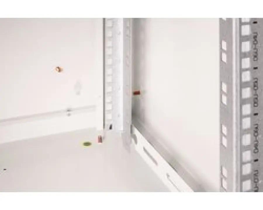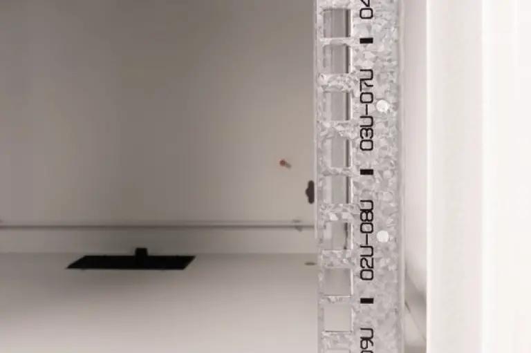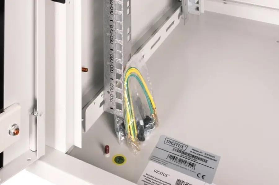 De kast is voorzien van een afsluitbare frontdeur van veiligheidsglas met een stalen frame, zodat je apparatuur goed zichtbaar en beschermd is. Voor- en achterin zijn 483 mm (19 inch) profielrails gemonteerd die je in de diepte kunt verstellen, zodat je flexibel bent in het plaatsen van apparatuur. Kabels kunnen netjes worden weggewerkt via speciale openingen aan de achterkant, bodem en bovenkant met verschuifbare afdekkingen.