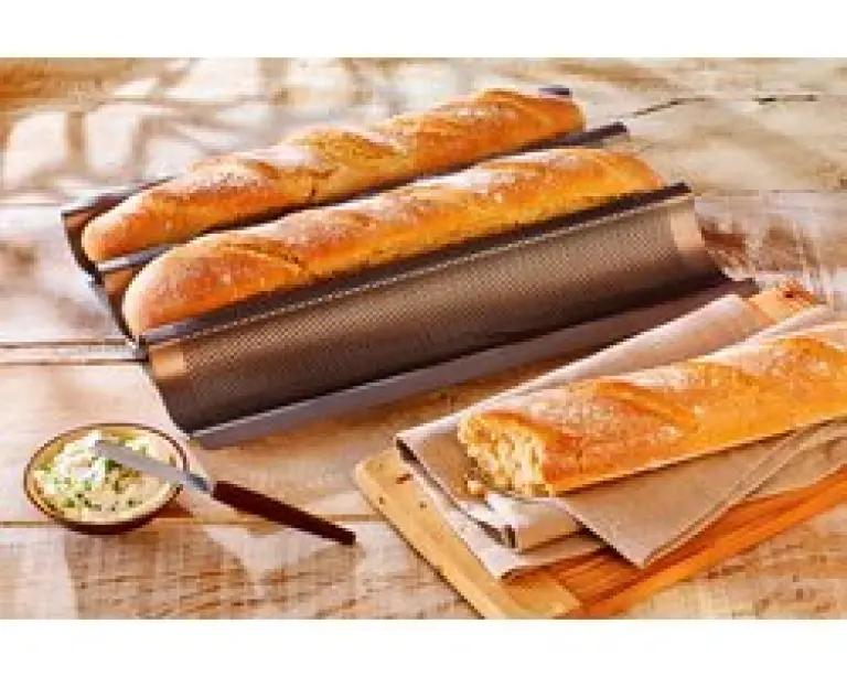 Met de Birkmann 210141 bakplaat bak je moeiteloos drie stokbroden van elk 38 cm lang. Deze speciale bakvorm is ontworpen om te zorgen dat je brooddeeg niet uitloopt, zodat je altijd mooie, gelijkmatige stokbroden krijgt. Ideaal voor stokbroden tot 300 gram per stuk.
