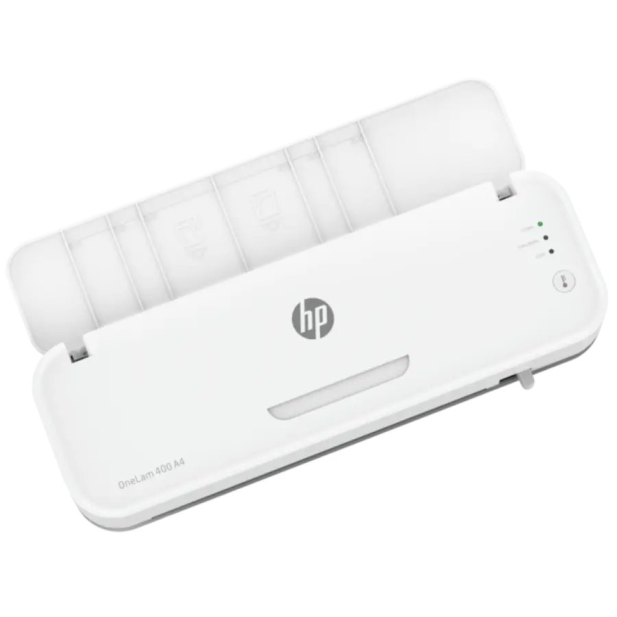 Met een intuïtieve knopbediening en een gebruiksklaar-indicatielampje is het eenvoudig om de juiste temperatuur in te stellen. De machine schakelt automatisch uit na 30 minuten inactiviteit, wat energie bespaart en veiligheid verhoogt. De HP OneLam 400 A4 wordt geleverd met een handige snijliniaal die je in een speciaal vakje onder het apparaat kunt opbergen, een hoekschraper en een uitgebreide beginner set van 15 lamineerzakjes in verschillende formaten. Zo heb je alles direct bij de hand voor je lamineerplezier.