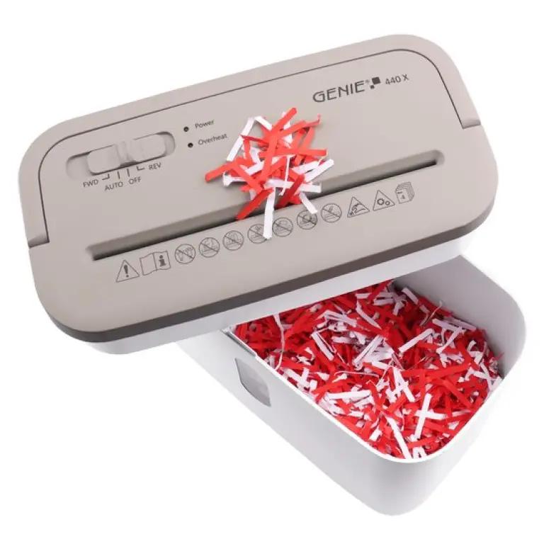 De Genie 440X heeft een opvangbak van 8 liter met een kijkvenster, zodat je precies ziet wanneer hij vol is. De LED-indicatielampjes geven aan wanneer het apparaat gereed is (groen) of wanneer het oververhit raakt (rood). Met een geluidsniveau van 72 dB werkt hij rustig genoeg om niet te storen tijdens het gebruik. Het snijtype is cross cut, waardoor het papier in kleine snippers van 4x38 mm wordt versnipperd. Dit zorgt voor een hoge mate van veiligheid volgens de P-4 norm (DIN 66399).