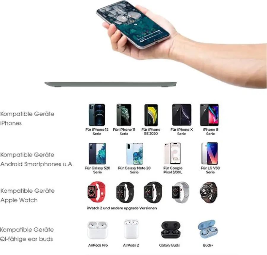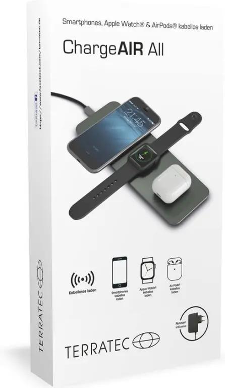 Met een vermogen van 5 of 10 watt voor smartphones en AirPods en 3,25 watt voor de Apple Watch zorgt de ChargeAIR All ervoor dat je apparaten snel weer opgeladen zijn. Het slimme ontwerp biedt ruimte aan meerdere apparaten tegelijk: links en rechts kun je je smartphone of AirPods opladen, terwijl in het midden je Apple Watch zijn plekje heeft. Zo houd je al je belangrijke gadgets altijd klaar voor gebruik.