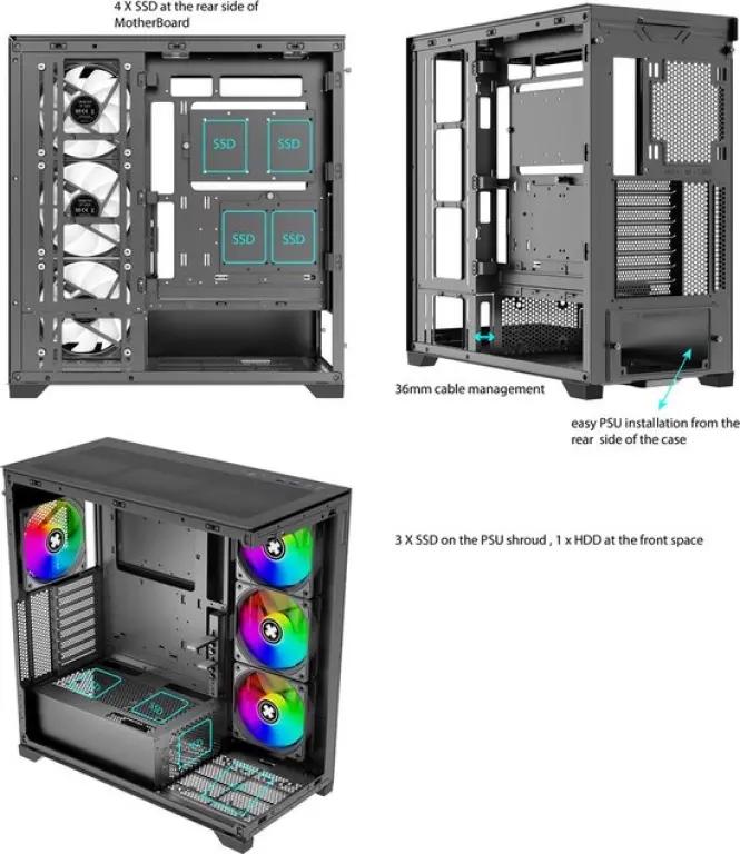 Deze behuizing biedt ruimte voor meerdere ventilatoren: tot wel 3 aan de zijkant, 3 aan de bovenzijde en 1 achterzijde. Dit zorgt voor een uitstekende luchtcirculatie om jouw componenten koel te houden tijdens intensief gebruik. Ook ondersteunt de behuizing radiatoren tot 360 mm, ideaal voor waterkoeling.