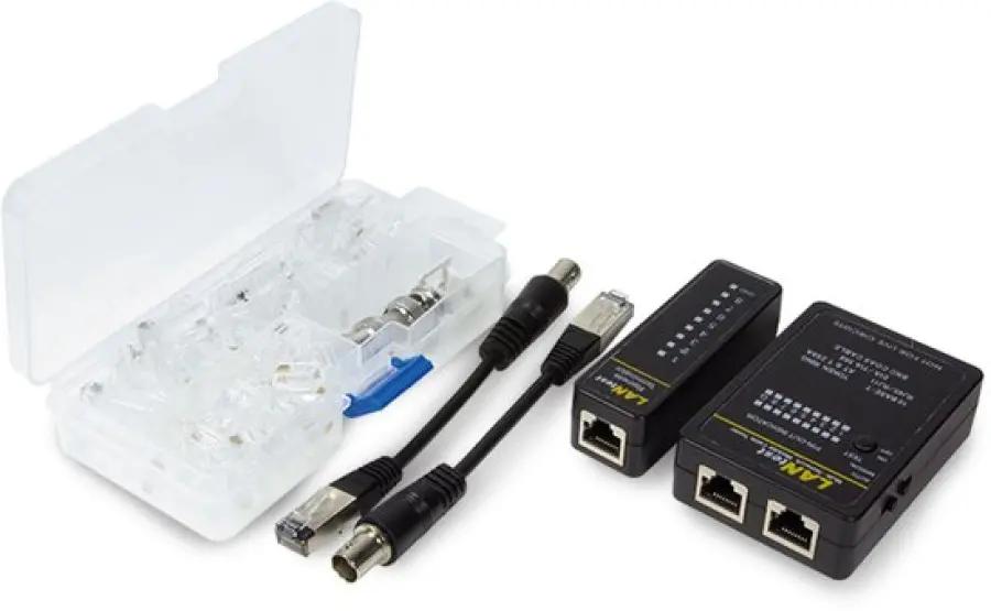 Naast het gereedschap vind je in de set ook een schroevendraaier met platte en kruiskop, plus 25 RJ11-connectoren en 25 RJ45-connectoren. De kabeltester ondersteunt RJ45, RJ11/12 en BNC aansluitingen, wat de set geschikt maakt voor diverse netwerktypen.