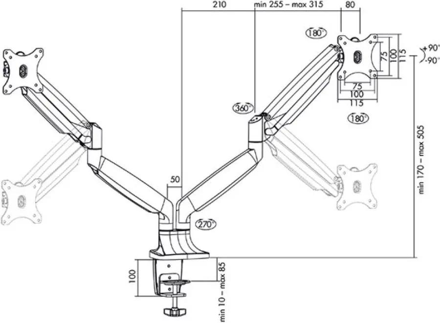 De BP0043 monitorbeugel is in hoogte verstelbaar, zodat je jouw schermen altijd op de perfecte kijkhoogte kunt plaatsen. De montage gebeurt via een klem of doorvoer aan je bureau, en het compatibele montagevlak is maximaal 100 x 100 mm. Dit maakt installatie snel en makkelijk, zonder gedoe.
