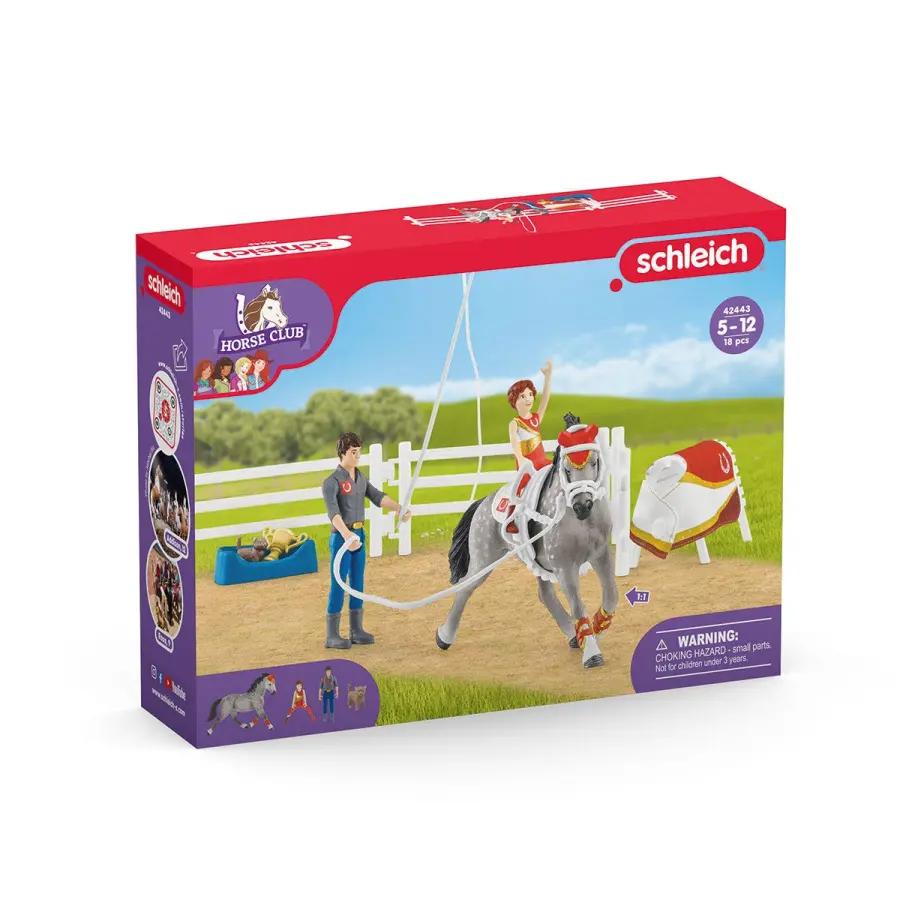 Mia is het kleine meisje dat zich met de voltige-set van Schleich® Horse Club perfect kan voorbereiden op haar eerste wedstrijd. Rij-instructeur Tom maakt het wedstrijdpaard vast aan de voltige-longe en klapt zachtjes met de zweep zodat het paard gelijkmatig rond de cirkel loopt die je met de insteekbare hekken kunt maken. Mia, de zus van Hannah, heeft beweeglijke armen waarmee ze zich kan vasthouden en later de grote, gouden beker in ontvangst kan nenem. Zadel, paardentuig en deken zijn afneembaar en worden na de training op het dekenrek opgeborgen. Het bruine poesje kijkt vanuit haar gezellige mandje met belangstelling naar wat er allemaal gebeurt.