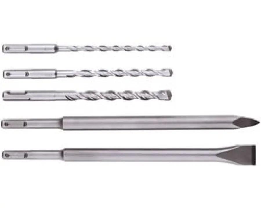 In de set vind je verschillende hamerboren met diameters van 6, 8 en 10 mm, een puntbeitel van 250 mm en een platte beitel van 250 x 20 mm. Alles wordt geleverd in een praktische, ronde plastic doos die je gemakkelijk meeneemt en opbergt. Zo heb je altijd de juiste maat en het juiste gereedschap bij de hand, netjes georganiseerd en beschermd tegen beschadigingen.
