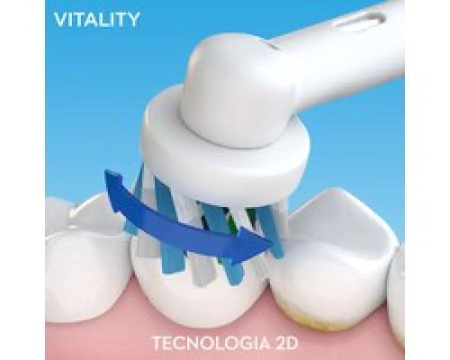 De Oral-B Vitality 100 CrossAction is dé elektrische tandenborstel voor volwassenen die op zoek zijn naar een effectieve en eenvoudige manier om hun tanden grondig te reinigen. Met de unieke 2D-reinigingsactie die oscilleert en roteert, verwijdert deze tandenborstel meer tandplak dan een gewone manuele tandenborstel. Dankzij de borstelharen die onder een hoek van 16 graden zijn geplaatst, wordt elke tand zorgvuldig omhuld en schoongepoetst.