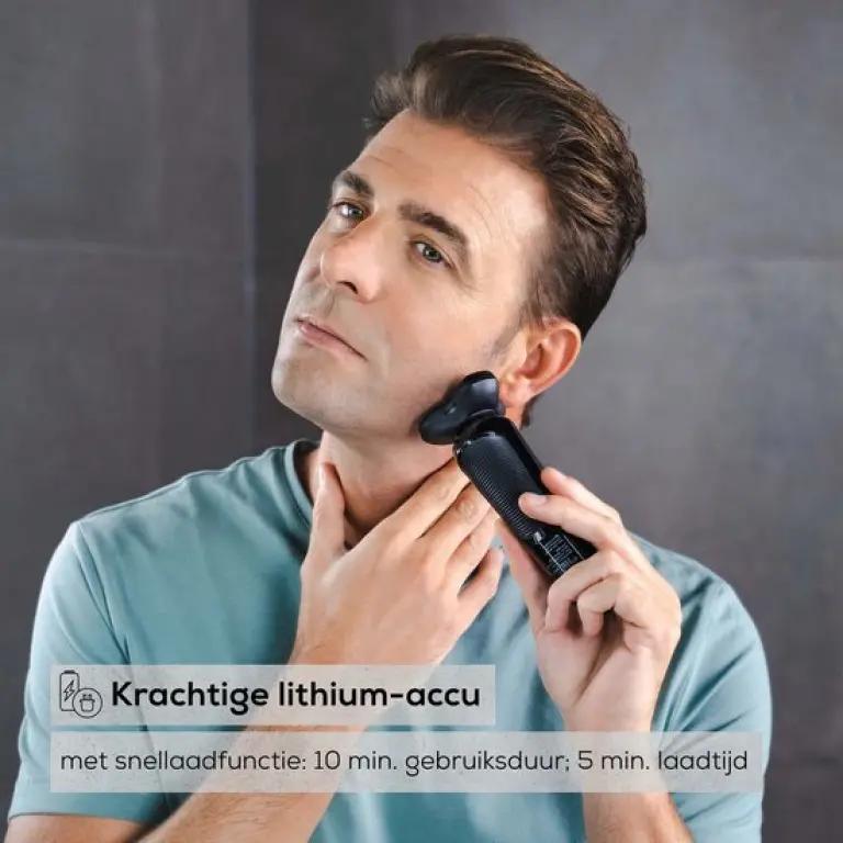 De drie roterende scheerkoppen passen zich perfect aan de contouren van het gezicht aan en zorgen voor een glad en zacht scheerresultaat. Dankzij de magnetische bevestiging kan de scheerkop gemakkelijk worden verwijderd. Met het precisietrimhulpstuk kan de baard zelfs heel precies worden getrimd.