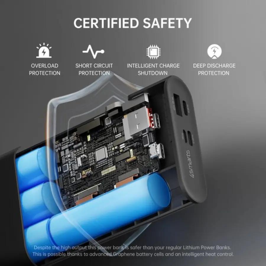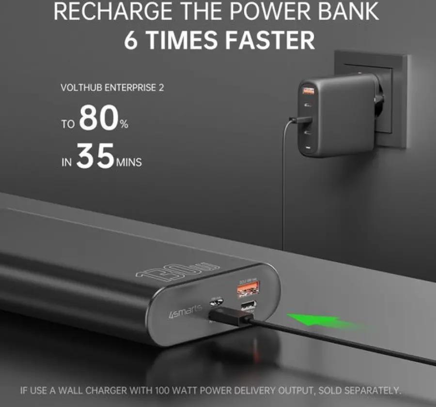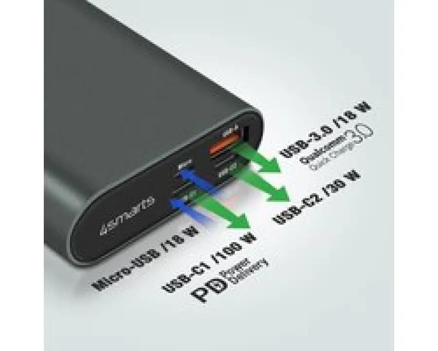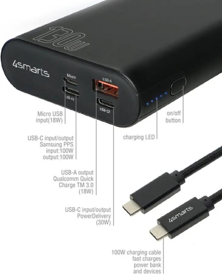 Met deze 4smarts powerbank laad jij je smartphone of tablet razendsnel op. De powerbank heeft een vermogen van 20.000 mAh en laadt 3 apparaten tegelijkertijd op met maximaal 130W. Met de 100W USB-C poort kun jij ook een laptop of MacBook op hoge snelheid opladen. Doordat de powerbank snelladen ondersteunt met o.a. Power Delivery en Quick Charge, is je batterij razendsnel opgeladen. Door de LED-indicator weet je wanneer je de powerbank weer moet opladen. Opladen kan via de USB-C poort met de meegeleverde 100W USB-C kabel (30cm) of via de micro USB poort.