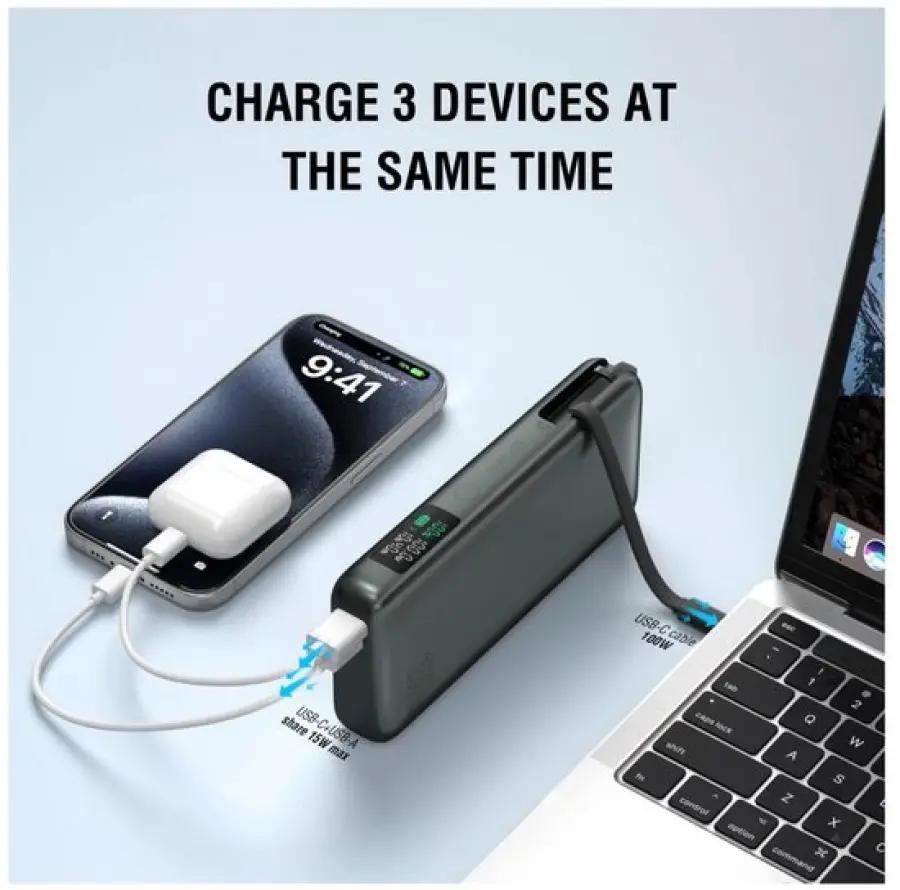 De powerbank beschikt over een ingebouwde 100W USB-C kabel, zo hoef je nooit meer een kabel te vergeten. Naast deze kabel heb je ook een USB-A poort met maximaal 22,5W en een extra USB-C poort met maximaal 100W. Gebruik je alleen de USB-C poort, dan kun je apparaten extra snel opladen met snelladen tot 100W. Zo ben je altijd verzekerd van een snelle en efficiënte lading.