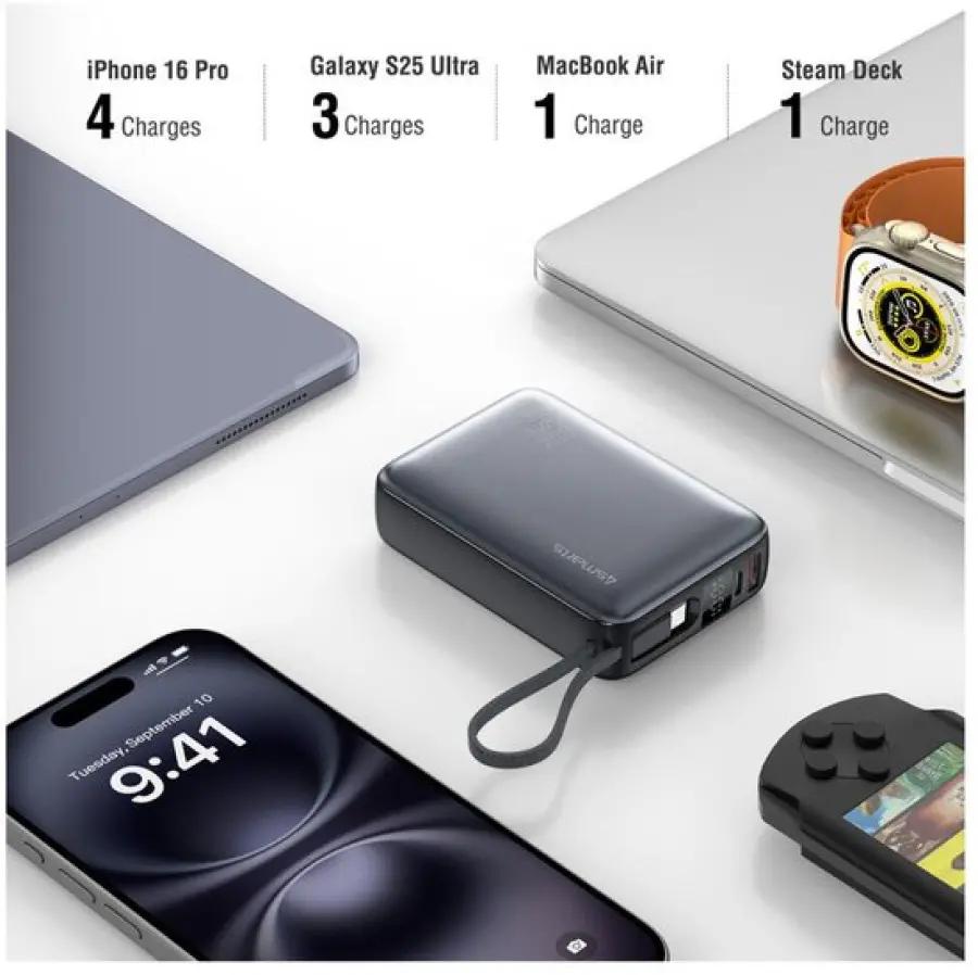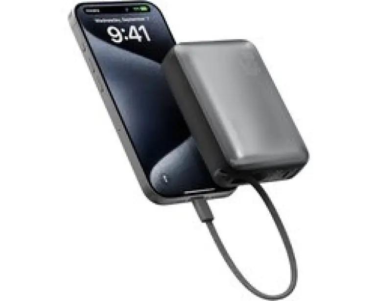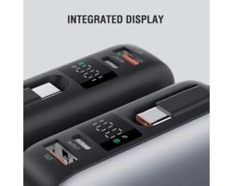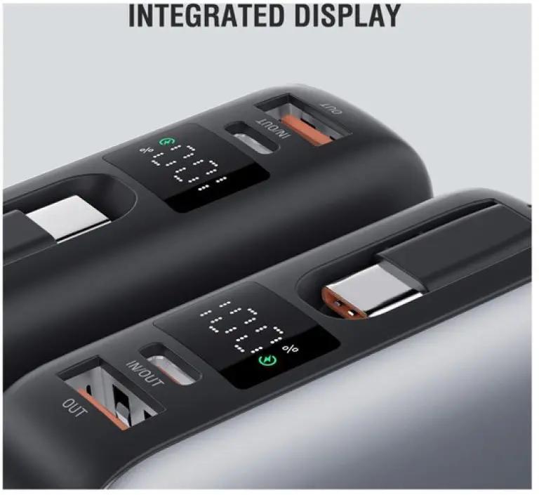Op het display lees je gemakkelijk de actuele oplaadstatus van de powerbank en zie je wanneer het tijd is om hem weer op te laden. Dit opladen gaat eenvoudig via de ingebouwde USB-C kabel met een input van maximaal 30W. Dankzij het compacte formaat van 10,3 × 7,1 × 2,9 cm past de powerbank makkelijk in je broekzak of tas, zodat je ‘m altijd bij de hand hebt.