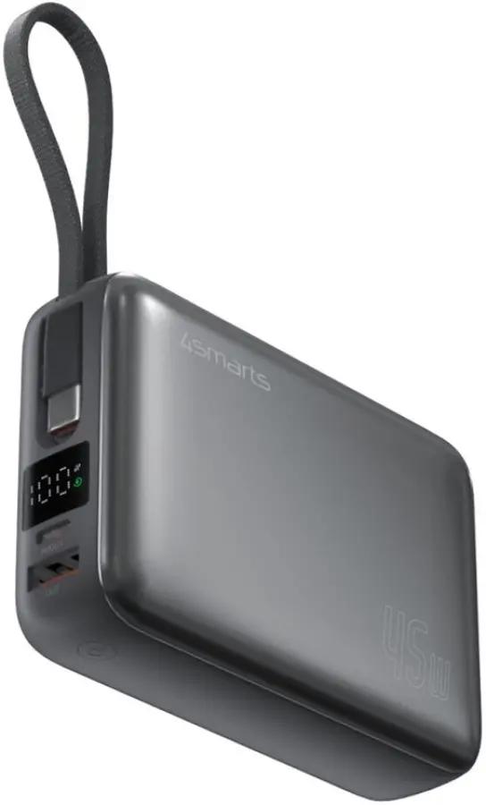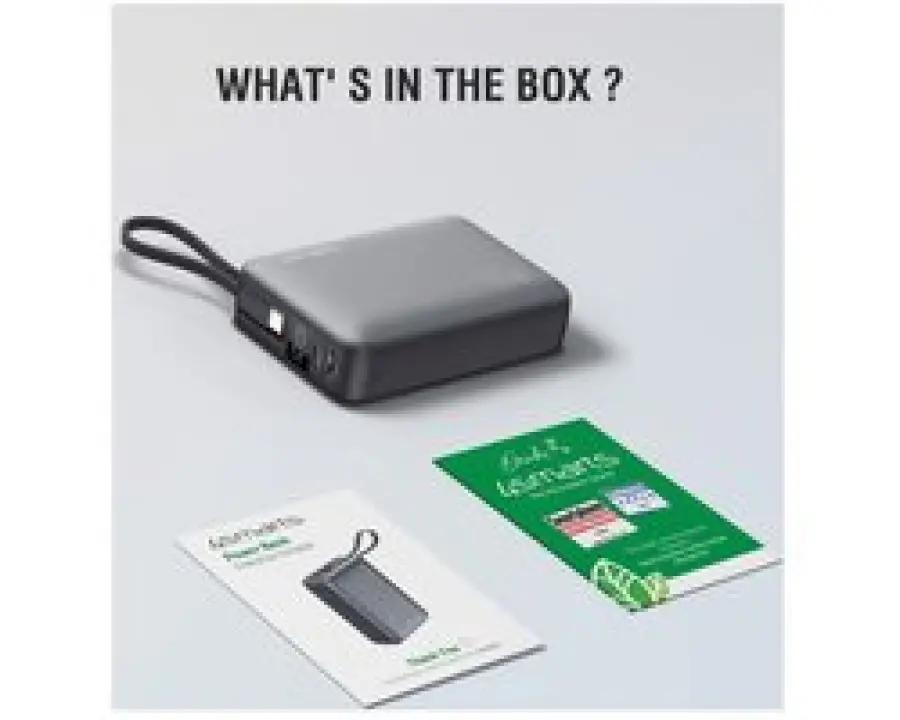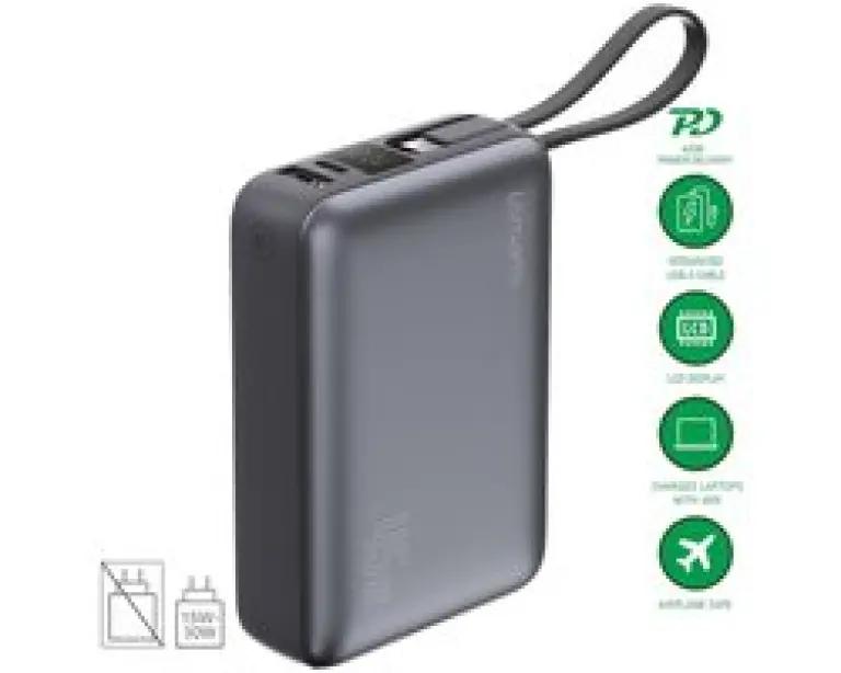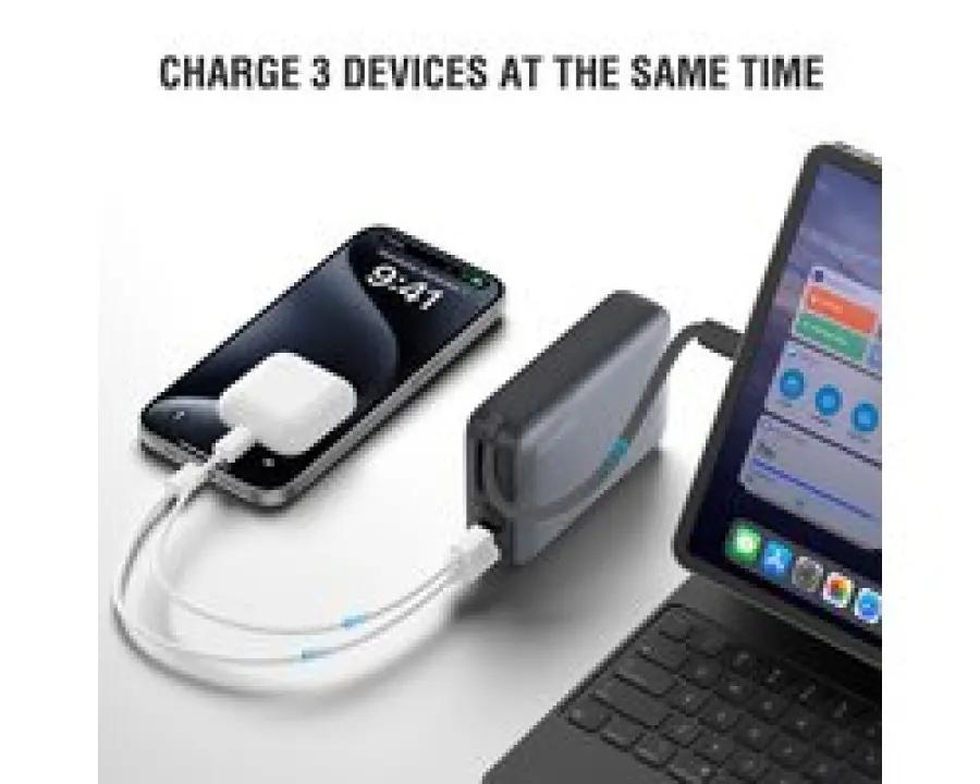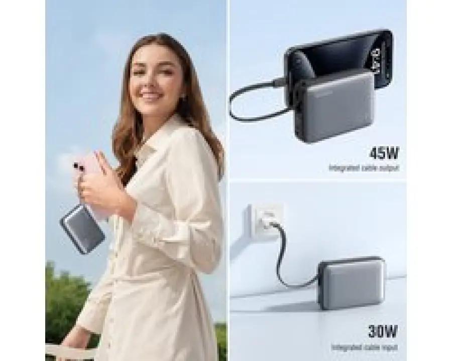 Deze powerbank heeft een ingebouwde USB-C kabel met een krachtige output van 45W. Zo kun je altijd opladen, zelfs als je je eigen kabeltje bent vergeten. Daarnaast biedt hij een USB-A poort met een max. output van 22,5W en een aparte USB-C poort met maximaal 45W output. Gebruik je alleen de USB-C poort? Dan profiteer je van snel opladen tot 45W, wat ook geschikt is voor grotere apparaten zoals een MacBook Air.