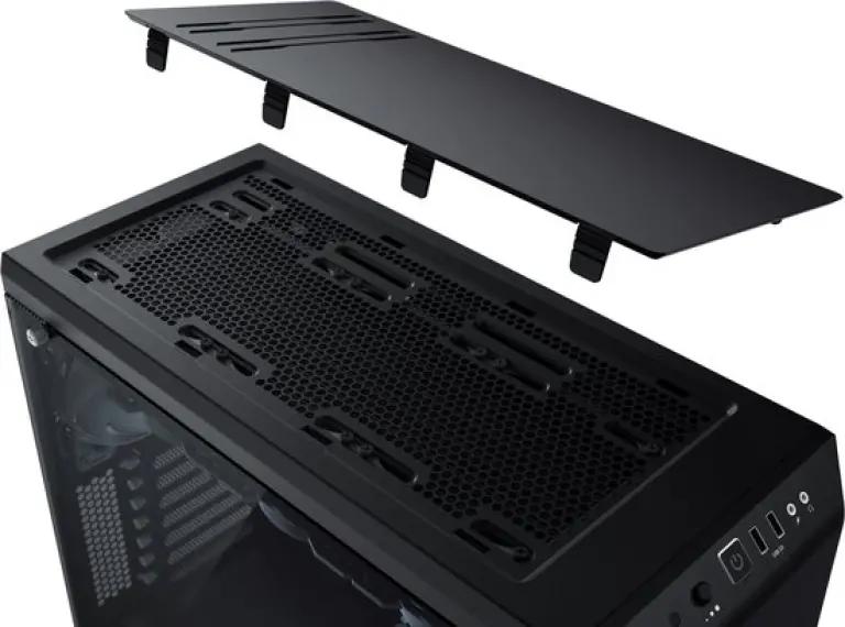 Deze behuizing is perfect geschikt voor waterkoeling, met speciale installatiepunten voor radiatoren tot 360 mm aan de voorkant, bovenkant en achterkant. De verstelbare top-cover maakt het mogelijk om de koeling aan te passen: je kunt hem gesloten houden voor een stille werking, half openen voor betere luchtstroom, of helemaal verwijderen om een radiator te plaatsen.