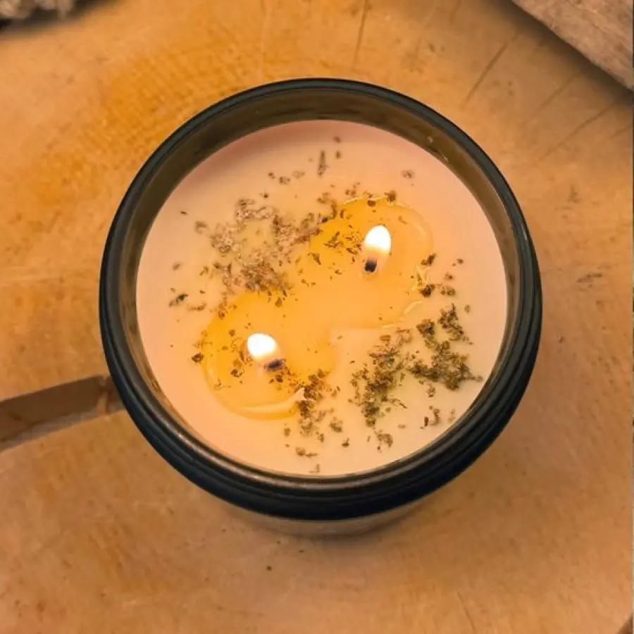 Deze kaars is gemaakt van 100% natuurlijke sojawas, wat zorgt voor een duurzame en schone verbranding. Dankzij de twee katoenen lonten brandt de kaars gelijkmatig en lang. De matzwarte glazen pot met dubbele wand geeft een luxe uitstraling die perfect staat in elk interieur. Bovendien bevat de kaars gedroogde CBD-hennep, wat het een unieke en decoratieve must-have maakt.