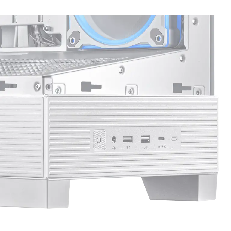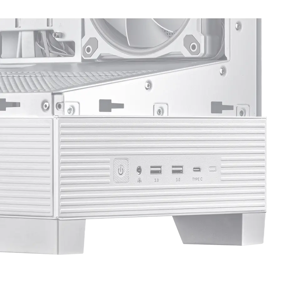 Met 2 USB 3.2 Gen 1 Type A-poorten en 1 USB 3.2 Gen 2.2 Type-C-poort aan de voorkant sluit je gemakkelijk al je randapparatuur aan. Ook een combo koptelefoon/microfoon poort is aanwezig, zodat je direct klaar bent voor gaming of videobellen. De aan-/uitknop is makkelijk bereikbaar en het gewicht van 9,1 kg zorgt dat de behuizing stevig staat, maar toch verplaatsbaar blijft.