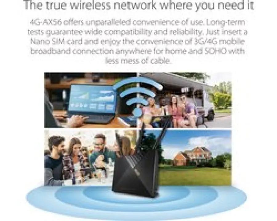 De ASUS 4G-AX56 is een geavanceerde draadloze router die gebruikmaakt van WiFi 6 technologie voor supersnelle en stabiele verbindingen. Met een gecombineerde snelheid tot wel 1800 Mbps (574 Mbps op 2.4 GHz en 1201 Mbps op 5 GHz) geniet je van een vloeiende internetervaring, ideaal voor streamen, gamen en thuiswerken.