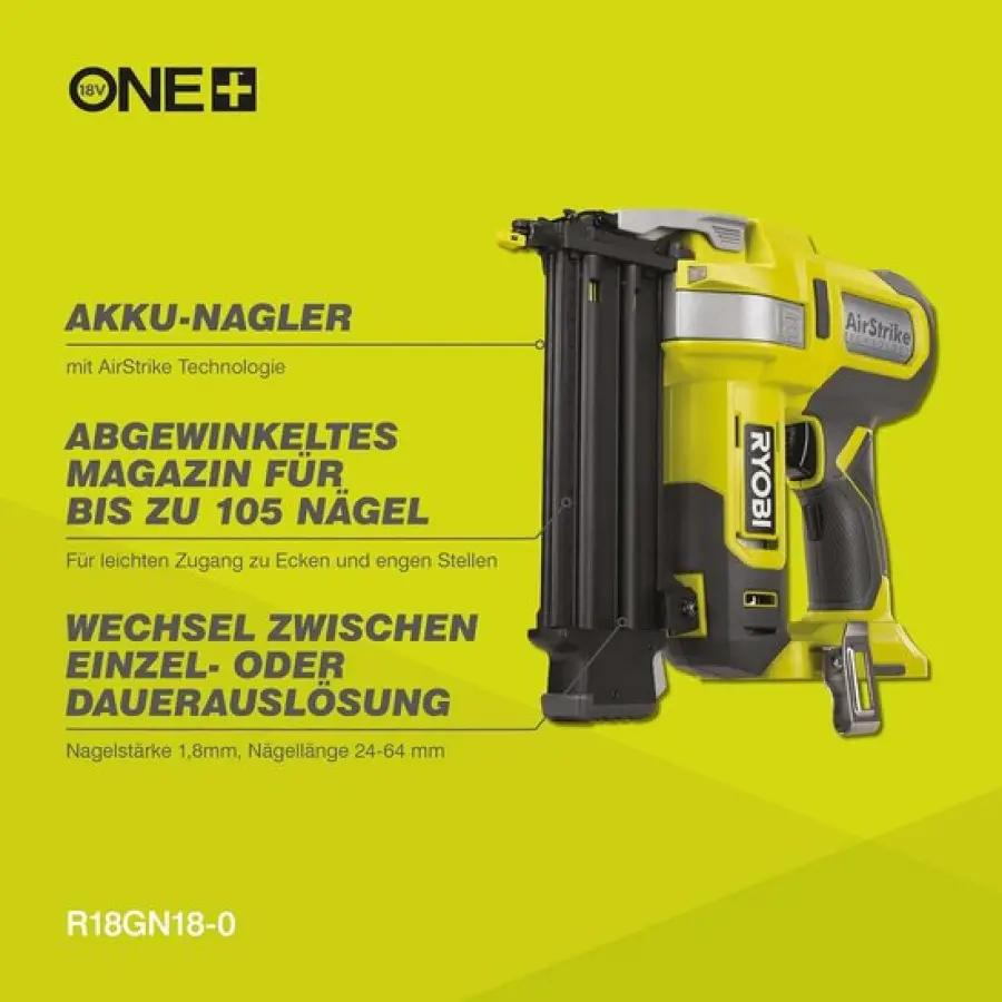 | Verpakkingsinhoud | - 1x RYOBI R18GN18 accu tacker - 500x 32 mm spijkers - 2x no-mar schoenen - 1x omkeerbare riemhaak - zonder accu, zonder oplader |