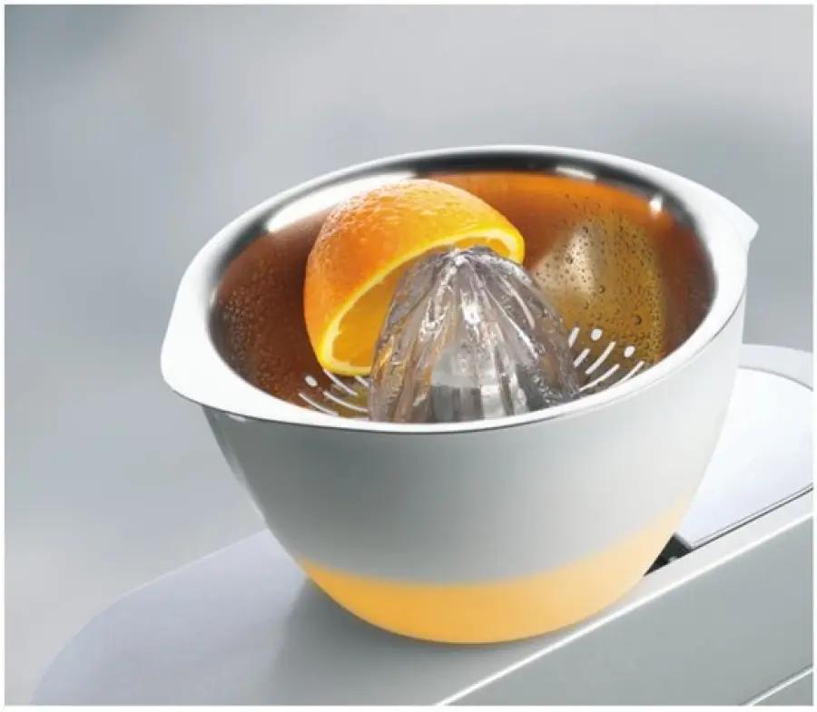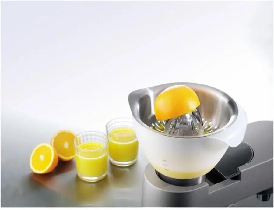 De roterende perskegel zorgt voor een efficiënte sapextractie. Het sap wordt opgevangen in een kom met een inhoud van 600 ml, ideaal voor direct gebruik in drankjes of bij het bereiden van desserts zoals sorbets, soufflés en gelatinepudding. De onderdelen zijn vaatwasmachinebestendig, wat het schoonmaken een stuk makkelijker maakt.