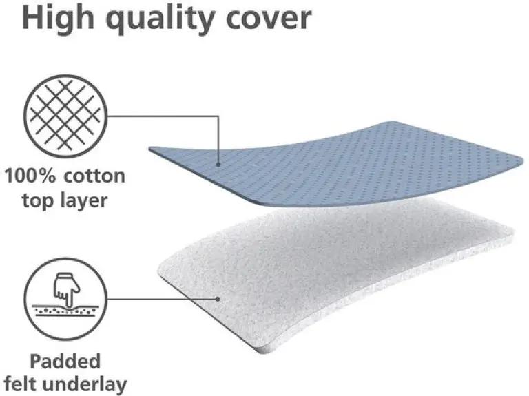 De hoes heeft een 100% katoenen toplaag die zacht aanvoelt en zorgt voor een glad strijkoppervlak. Daarnaast is de onderlaag dik en gewatteerd met vilt, wat zorgt voor extra demping en een betere warmteverdeling tijdens het strijken. Dit maakt het strijkproces makkelijker en comfortabeler.