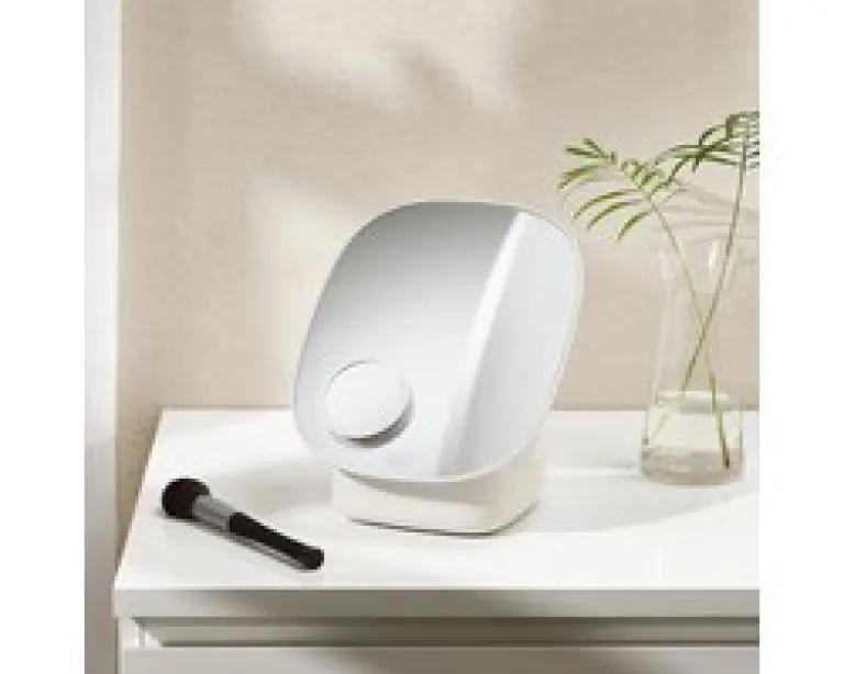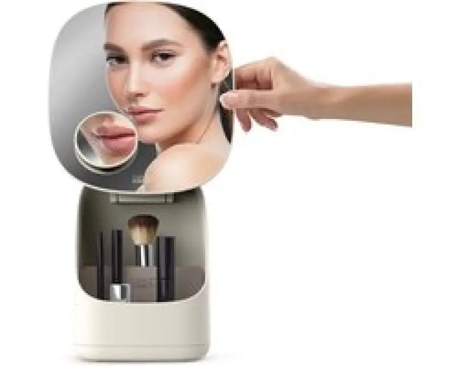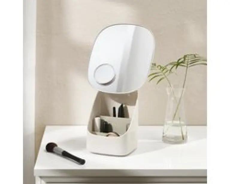De organizer is voorzien van een staande spiegel die je naar wens kunt kantelen. Zo zie je altijd je hele gezicht goed, ideaal tijdens het aanbrengen van make-up. Daarnaast is er een kleiner spiegeltje met 3x vergroting, waarmee je extra details kunt bekijken. De spiegel kun je optillen om bij de vakken eronder te komen, zo combineer je functionaliteit met slim design.