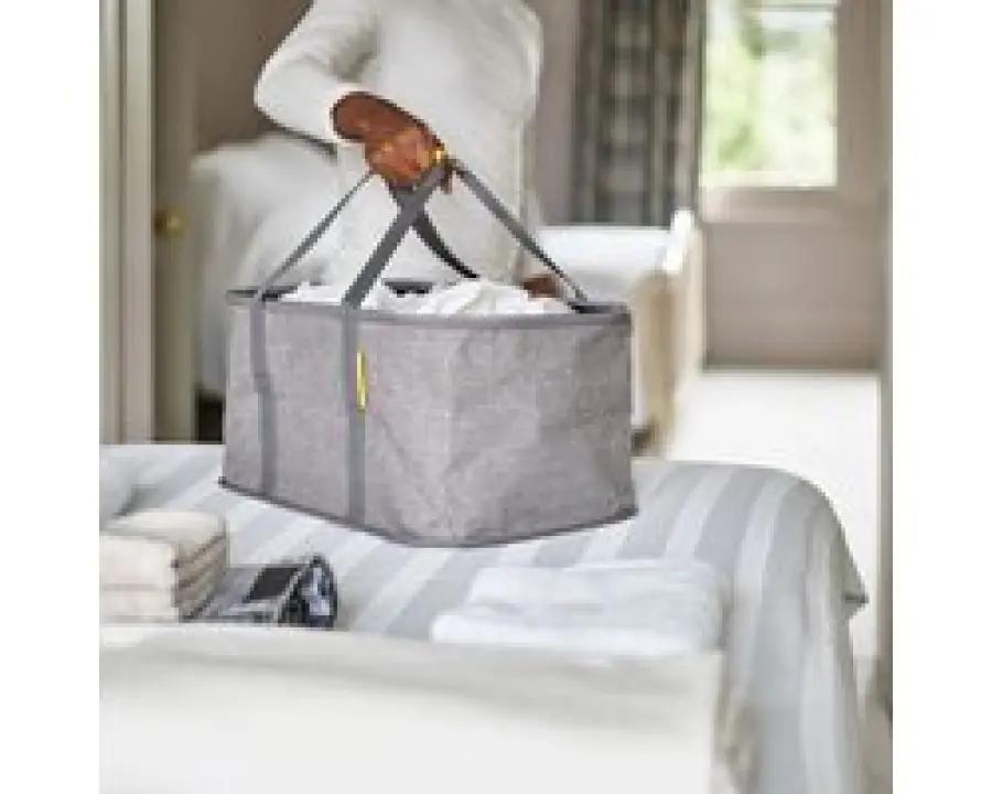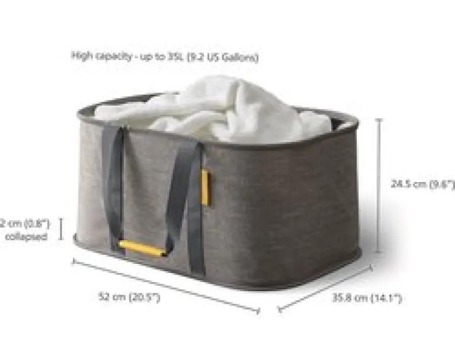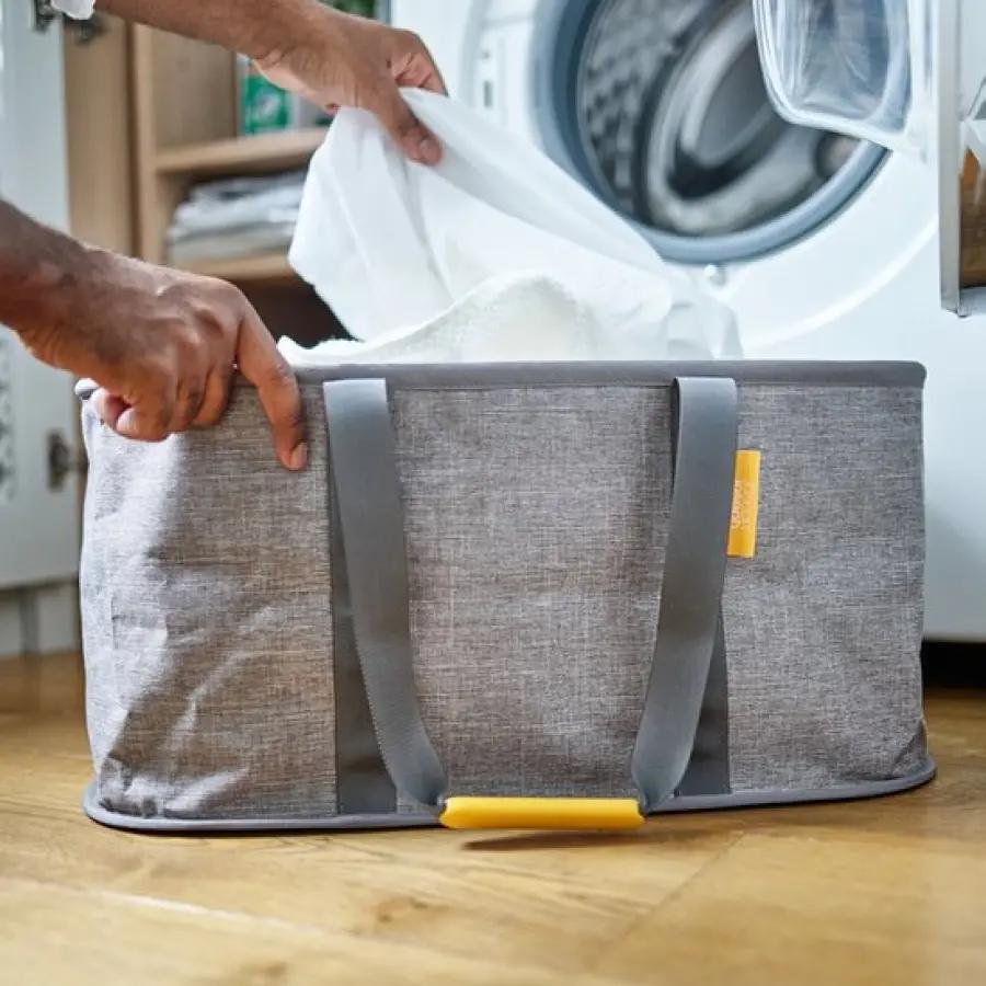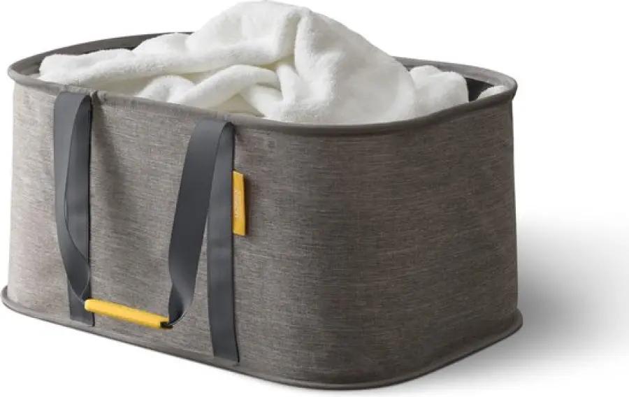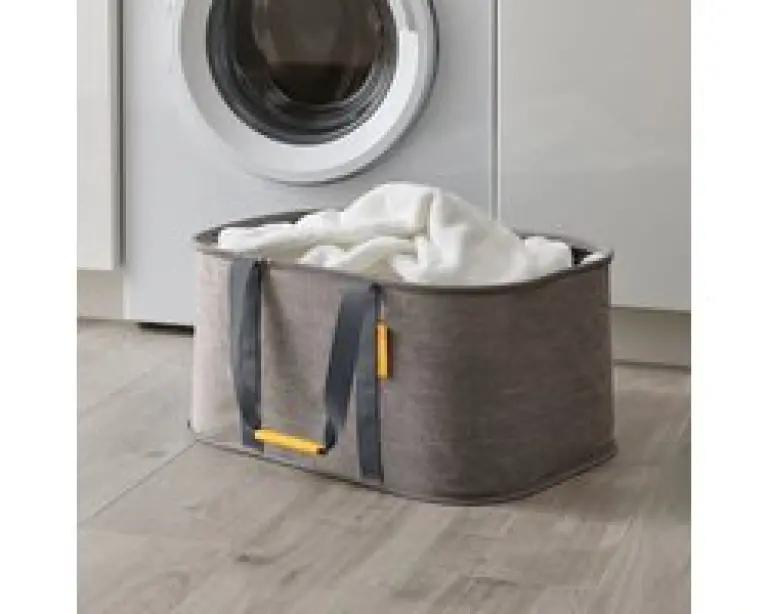 De wasmand is uitgerust met stevige rubberen handgrepen die het dragen van volle ladingen wasgoed comfortabel maken. Met een inhoud van 35 liter biedt hij genoeg ruimte voor meerdere wasbeurten, zonder dat hij onhandig groot wordt. Het materiaal is duurzaam polyester dat zijn vorm behoudt, ook als de mand leeg is.