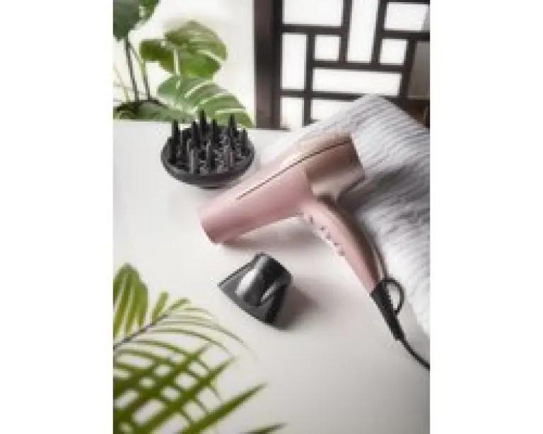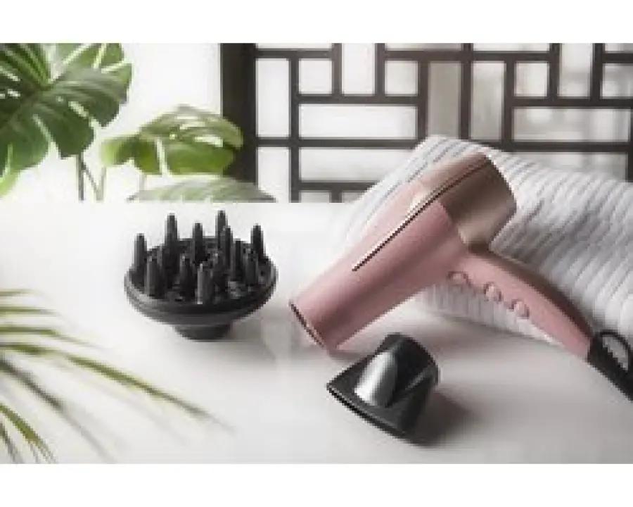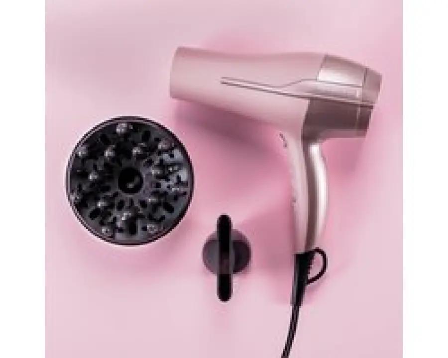 De föhn wordt geleverd met een blaasmond voor gericht en snel drogen, en een diffuser die perfect is voor het creëren van volume of het accentueren van je natuurlijke krul. Het uitneembare rooster aan de achterzijde maakt schoonmaken eenvoudig, en het ophangoog zorgt dat je de föhn makkelijk kunt opbergen. Bovendien is de föhn uitgerust met een koelstand voor het fixeren van je kapsel.