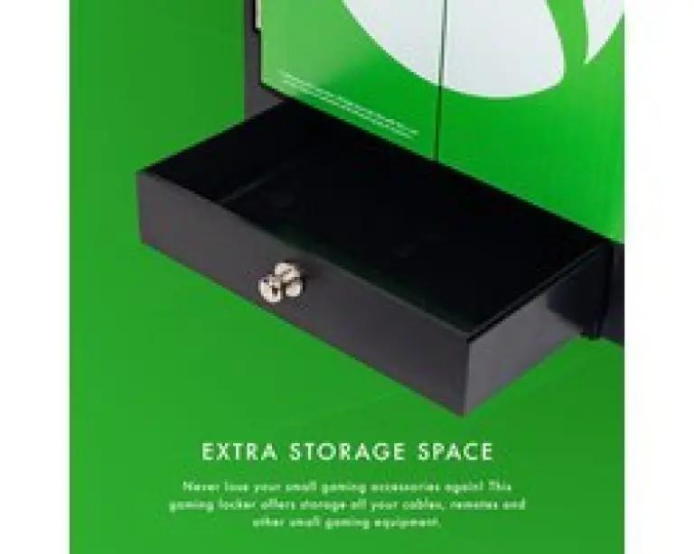 De locker is ontworpen om jouw gaming accessoires optimaal te organiseren. Je kunt tot 4 controllers ophangen en je koptelefoon stevig op de bovenkant bevestigen, zodat deze nooit in de knoop raakt. Daarnaast is er een onderliggende trekhaak perfect voor kabels, afstandsbedieningen en andere apparatuur. De voordeuren van de locker gaan gemakkelijk open en dicht, wat het gebruik nog eenvoudiger maakt.
