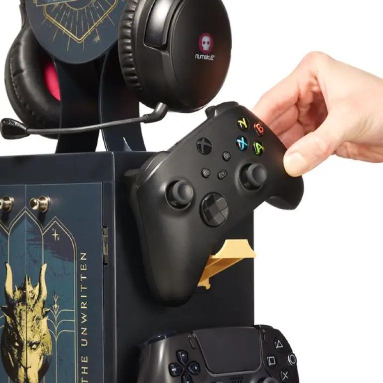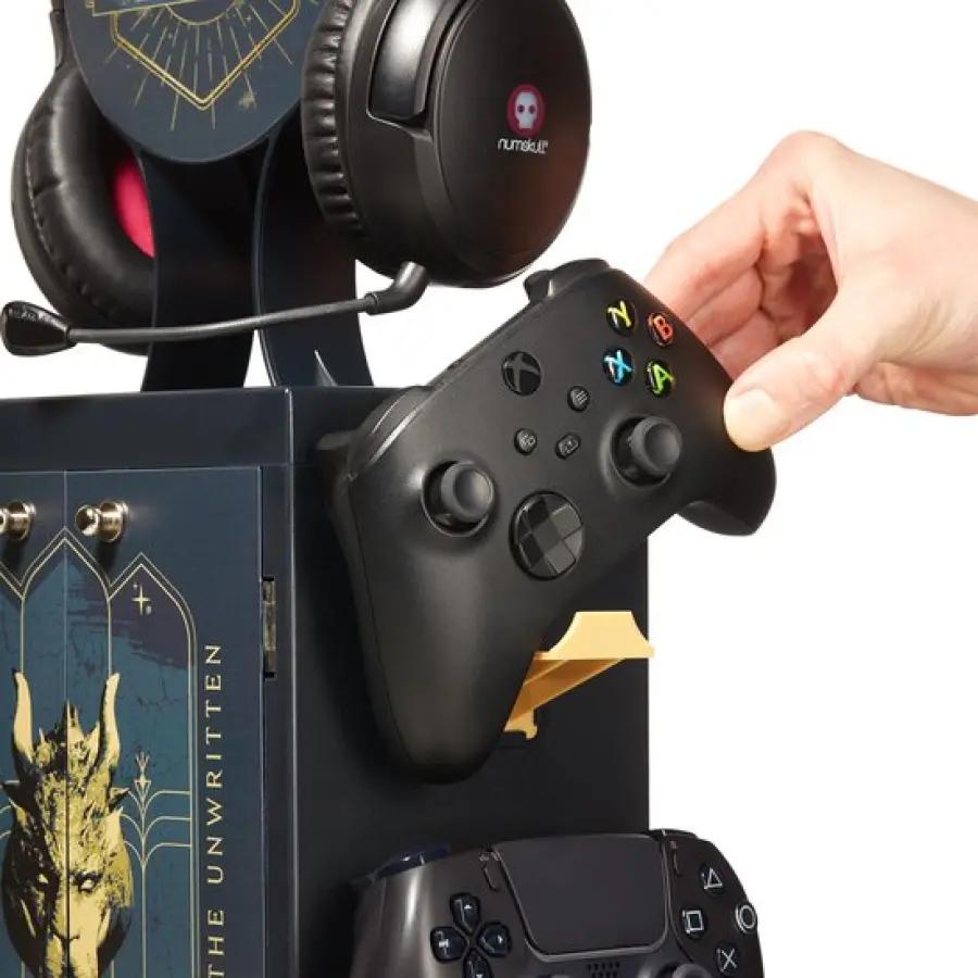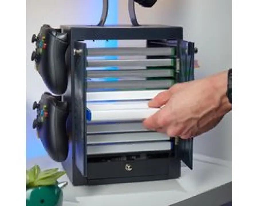 De locker biedt plaats aan maximaal 10 Xbox One, Xbox Series X|S, PlayStation 4 of PlayStation 5 games en films. Daarnaast kun je tot 4 controllers ophangen, zodat je ze altijd bij de hand hebt. De bovenkant is voorzien van een koptelefoonhouder waar je je headset veilig en stijlvol kunt opbergen. Onderin vind je een handige lade waar je kabels, duimgrepen, afstandsbedieningen en andere gamebenodigdheden overzichtelijk kunt bewaren.