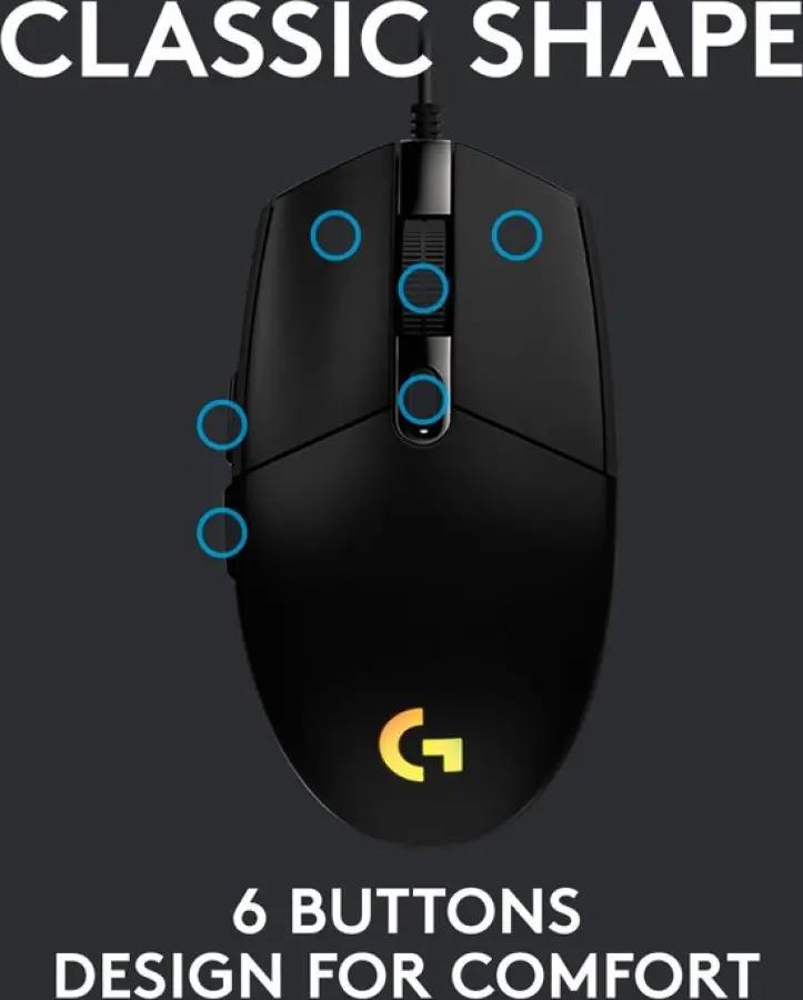 Deze nieuwste G203-gamemuis van Logitech is met draad verbonden en heeft een 8000dpi-sensor en 6 programmeerbare knoppen. Bovendien is deze Lightsync-variant voorzien van adresseerbare RGB-leds - zowel het logo als een strook op de behuizing van de muis.